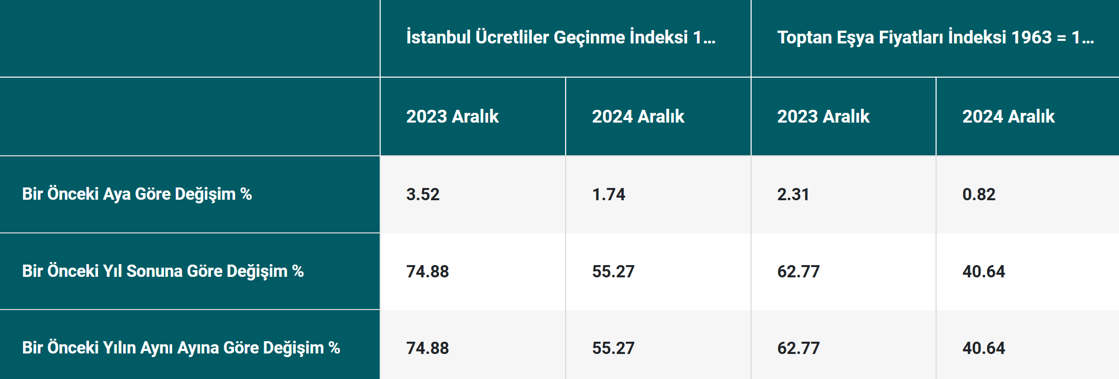 İTO, İstanbul'da aralık ayında perakende fiyatların aylık yüzde 1,74, yıllık ise yüzde 55,27 artış gösterdiğini açıkladı. İstanbul Ticaret Odası (İTO), aralık ayı İstanbul Ücretliler Geçinme İndeksi ile Toptan Eşya Fiyatları İndeksi verilerini açıkladı. Buna göre, aralıkta bir önceki aya göre perakende fiyat hareketlerinin göstergesi olan İstanbul Ücretliler Geçinme İndeksi yüzde 1,74, toptan fiyat hareketlerinin göstergesi olan Toptan Eşya Fiyatları indeksi yüzde 0,82 artış kaydetti. Önceki yılın aralık ayı incelendiğinde ise perakende fiyatların yüzde 55,27, toptan fiyatların yüzde 40,64 arttığı görüldü. Kasımda aylık bazda perakende fiyatlar yüzde 3,07, toptan fiyatlar ise yüzde 2,68 artış göstermişti. Kaynak: İTO Enflasyon beklentilerinde sınırlı iyileşme görülmüştü TCMB tarafından açıklanan Sektörel Enflasyon Beklentileri anketinin sonuçları, enflasyon beklentilerinde tüm kesimlerde sınırlı bir iyileşme gerçekleştiğini ortaya koymuştu. Buna göre 2024 yılı Aralık ayında 12 ay sonrası yıllık enflasyon beklentileri, piyasa katılımcıları için 0,1 puan azalarak yüzde 27,1 seviyesine, reel sektör için 0,2 puan azalarak yüzde 47,6 seviyesine, hanehalkı için 1 puan azalarak yüzde 63,1 seviyesine gerilemişti. Kaynak: TCMB - Sektörel Enflasyon Beklentileri Gözler resmi enflasyon rakamlarında Türkiye İstatistik Kurumunun (TÜİK) resmi enflasyon rakamlarını ise 3 Ocak’ta açıklaması bekleniyor. Enflasyon rakamlarının açıklanması sonrasında emekli ve memur maaşlarıyla birlikte yeni yılda kiralarda uygulanacak zam sınırı da netlik kazanacak. [news_id:756881]