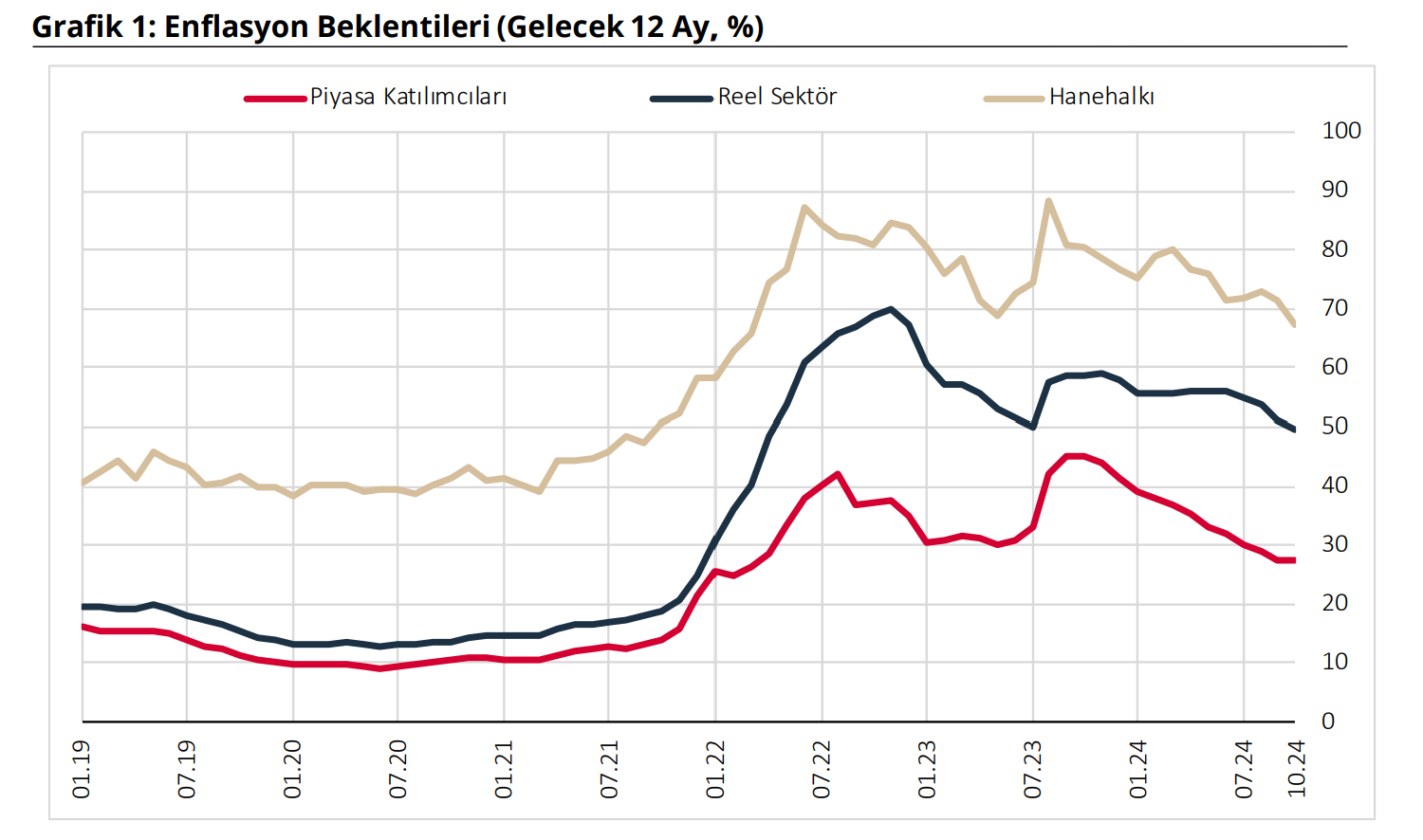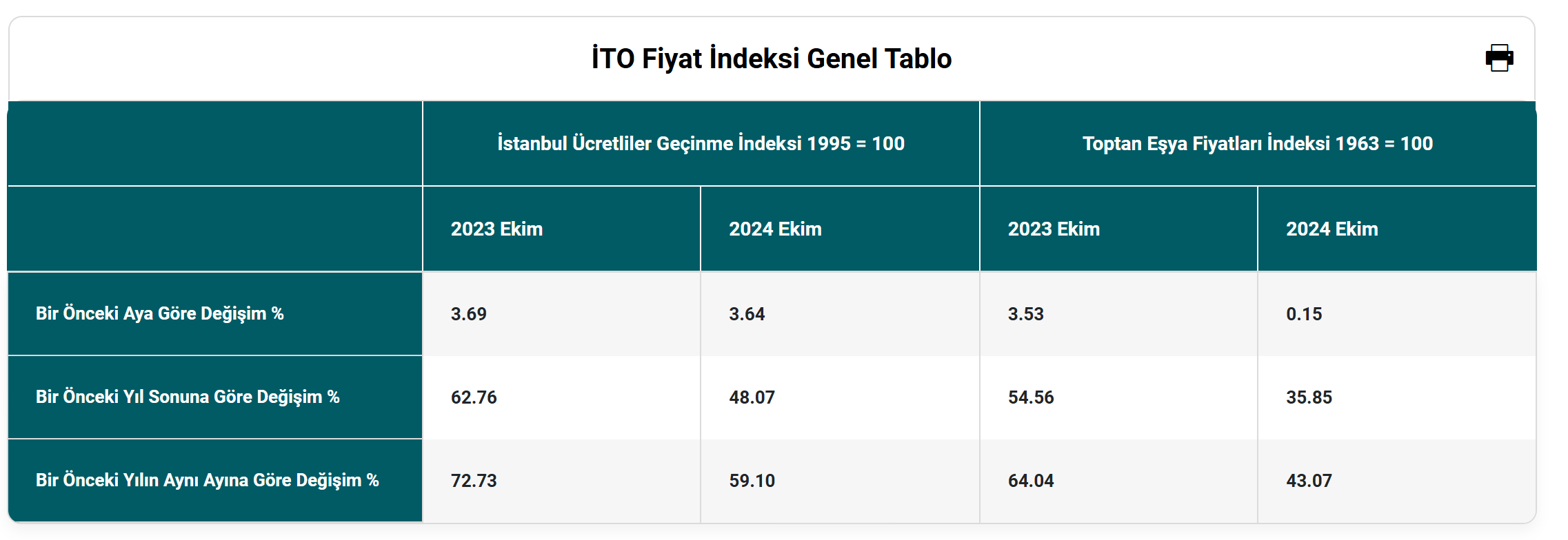 İTO, İstanbul'da ekim ayında perakende fiyatların aylık yüzde 3,64, yıllık ise yüzde 59,10 artış gösterdiğini açıkladı. İstanbul Ticaret Odası (İTO), ekim ayı İstanbul Ücretliler Geçinme İndeksi ile Toptan Eşya Fiyatları İndeksi verilerini açıkladı. Buna göre, ekimde bir önceki aya göre perakende fiyat hareketlerinin göstergesi olan İstanbul Ücretliler Geçinme İndeksi yüzde 3,64, toptan fiyat hareketlerini yansıtan Toptan Eşya Fiyatları indeksi ise yüzde 0,15 artış kaydetti. Eylülde aylık bazda perakende fiyatlar yüzde 3,90, toptan fiyatlar ise yüzde 4,67 artış göstermişti. Önceki yılın ekim ayı incelendiğinde ise perakende fiyatların yüzde 59,10, toptan fiyatların ise yüzde 43,07 arttığı görüldü. Kaynak: İTO Enflasyon beklentilerinde iyileşme görülmüştü TCMB tarafından açıklanan Sektörel Enflasyon Beklentileri anketinin sonuçları ise enflasyon beklentilerinin tüm kesimlerde iyileştiğini göstermişti. Buna göre 2024 yılı Ekim ayında 12 ay sonrası yıllık enflasyon beklentileri, piyasa katılımcıları için 0,1 puan azalarak yüzde 27,4 seviyesine, reel sektör için 1,6 puan azalarak yüzde 49,5 seviyesine, hanehalkı için 4,4 puan azalarak yüzde 67,2 seviyesine gerilemişti. Hazine ve Maliye Bakanı Mehmet Şimşek de veriye ilişkin sosyal medya hesabından yaptığı paylaşımda, “Kararlılıkla uyguladığımız programımızla enflasyon görünümü ve beklentilerdeki olumlu seyir devam edecek." değerlendirmesinde bulunmuştu. [news_id:751000]