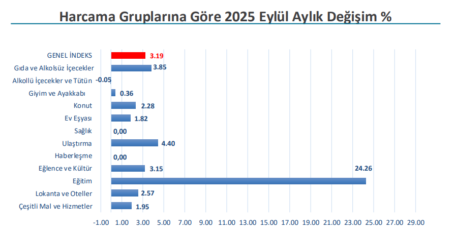 İTO, İstanbul'da perakende fiyatların eylül ayında aylık yüzde 3,19, yıllık ise yüzde 40,75 artış gösterdiğini açıkladı. İstanbul Ticaret Odası (İTO), eylül ayı Tüketici Fiyat İndeksi verilerini açıkladı. Açıklanan verilere göre İstanbul’da perakende fiyat hareketlerinin göstergesi olan İstanbul Tüketici Fiyat İndeksi aylık bazda %3,19 artış kaydetti. Bir önceki yılın aynı ayına göre değişim oranı ise %40,75 olarak kayıtlara geçti. Ağustos ayında İstanbul'da perakende fiyatlar aylık yüzde 1,84, yıllık ise yüzde 40,83 artış göstermişti. Eğitim grubunda aylık yüzde 24 artış 2025 Eylül ayında İstanbul Tüketici Fiyat İndeksinde; bir önceki aya göre Eğitim harcamaları grubunda yüzde 24,26, Ulaştırma harcamaları grubunda yüzde 4,40, Gıda ve Alkolsüz İçecekler harcama grubunda yüzde 3,85, Eğlence ve Kültür harcamaları grubunda yüzde 3,15, Lokanta ve Oteller harcama grubunda yüzde 2,57, Konut harcamaları grubunda yüzde 2,28, Çeşitli Mal ve Hizmetler harcama grubunda yüzde 1,95, Ev Eşyası harcamaları grubunda yüzde 1,82, Giyim ve Ayakkabı Harcamaları grubunda ise yüzde 0,36 artış, Alkollü İçecekler ve Tütün harcama grubunda yüzde 0,05 azalış görüldü. Haberleşme ve Sağlık Harcamaları gruplarında fiyat değişimi gerçekleşmedi. Kaynak: İTO TÜİK resmi verileri cuma günü açıklayacak Türkiye İstatistik Kurumu (TÜİK) ise eylül ayına ilişkin resmi enflasyon verilerini 3 Ekim 2025 tarihinde saat 10.00’da açıklayacak. Verinin açıklanmasının ardından ekim ayında kiralarda uygulanabilecek tavan artış oranı da netlik kazanacak. Son olarak ağustos ayı enflasyon verisinin açıklanmasının ardından eylülde kiralarda uygulanabilecek tavan zam oranı yüzde 39,62 olarak belirlenmişti. [news_id:783590] [news_id:786508]