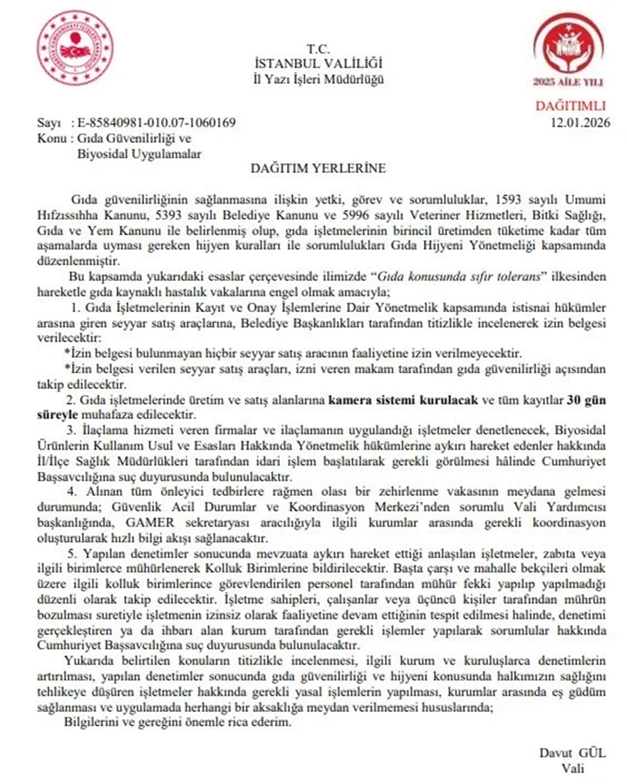 İstanbul Valiliği tarafından hazırlanan yeni genelge kapsamında seyyar satıcılar ile ilaçlama faaliyetleri yürüten işletmelere yönelik denetimlerin kapsamı genişletiliyor. İstanbul'da yeni yılın hemen öncesinde kayıtlara geçen zehirlenme olaylarının ardından İstanbul Valiliği harekete geçerek önemli bir adım attı. Valilik makamınca yayımlanan ve ilgili birimlere ulaştırılan genelge uyarınca, seyyar satış yapanlar ile ilaçlama hizmeti sunan firmalara yönelik sıkı denetim mekanizmaları devreye giriyor. Hazırlanan yeni kurallar çerçevesinde, resmi makamlardan alınmış geçerli bir izin belgesi bulunmayan hiçbir seyyar satıcının faaliyetlerini sürdürmesine müsaade edilmeyecek. Kamera kayıtları bir ay boyunca saklanacak Satış yapma hakkı tanınan seyyar esnaflar da bundan böyle izni veren yetkili makamın sürekli takibi altında tutulacak. Gıda işletmeleri ile ürün satış alanlarında kurulması zorunlu hale getirilen kamera sistemleri aracılığıyla denetimler dijital ortamda da desteklenecek. Güvenliği ve hijyen standartlarını sağlamak amacıyla oluşturulan bu kamera takip sistemindeki tüm kayıtların, herhangi bir aksaklık yaşanmaması adına 30 gün boyunca eksiksiz şekilde muhafaza edilmesi gerekecek. Bu sayede olası vakaların geçmişe dönük incelemeleri daha şeffaf bir şekilde yapılabilecek. İlaçlama firmalarına yönetmelik denetimi ve suç duyurusu Valilik duyurusunda dikkat çeken bir diğer başlık ise ilaçlama hizmetleri oldu. Yeni düzenleme kapsamında ilaçlama yapan şirketlerin yanı sıra bu hizmetin uygulandığı işletmeler de eş zamanlı olarak denetimden geçecek. Biyosidal Ürünlerin Kullanım Usul ve Esasları Hakkında Yönetmelik içerisinde yer alan maddelere aykırı davrandığı tespit edilen taraflar hakkında sağlık müdürlükleri kanalıyla idari işlemler başlatılacak. Kurallara uymayan kişi ve kurumlar için mevzuatın öngördüğü durumlarda Cumhuriyet Başsavcılığına suç duyurusu yapılarak adli süreçler de işletilecek. Valilik tarafından dağıtım yerlerine gönderilen genelge şöyle: "1. Gıda İşletmelerinin Kayıt ve Onay İşlemlerine Dair Yönetmelik kapsamında istisnai hükümler arasına giren seyyar satış araçlarına, Belediye Başkanlıkları tarafından titizlikle incelenerek izin belgesi verilecektir: • İzin belgesi bulunmayan hiçbir seyyar satış aracının faaliyetine izin verilmeyecektir. • İzin belgesi verilen seyyar satış araçları, izni veren makam tarafından gıda güvenilirliği açısından takip edilecektir. 2. Gıda işletmelerinde üretim ve satış alanlarına kamera sistemi kurulacak ve tüm kayıtlar 30 gün süreyle muhafaza edilecektir. 3. İlaçlama hizmeti veren firmalar ve ilaçlamanın uygulandığı işletmeler denetlenecek, Biyosidal Ürünlerin Kullanım Usul ve Esasları Hakkında Yönetmelik hükümlerine aykırı hareket edenler hakkında İl/İlçe Sağlık Müdürlükleri tarafından idari işlem başlatılarak gerekli görülmesi hâlinde Cumhuriyet Başsavcılığına suç duyurusunda bulunulacaktır. 4. Alınan tüm önleyici tedbirlere rağmen olası bir zehirlenme vakasının meydana gelmesi durumunda; Güvenlik Acil Durumlar ve Koordinasyon Merkezi'nden sorumlu Vali Yardımcısı başkanlığında, GAMER sekretaryası aracılığıyla ilgili kurumlar arasında gerekli koordinasyon oluşturularak hızlı bilgi akışı sağlanacaktır. 5. Yapılan denetimler sonucunda mevzuata aykırı hareket ettiği anlaşılan işletmeler, zabıta veya ilgili birimlerce mühürlenerek Kolluk Birimlerine bildirilecektir. Başta çarşı ve mahalle bekçileri olmak üzere ilgili kolluk birimlerince görevlendirilen personel tarafından mühür fekki yapılıp yapılmadığı düzenli olarak takip edilecektir. İşletme sahipleri, çalışanlar veya üçüncü kişiler tarafından mührün bozulması suretiyle işletmenin izinsiz olarak faaliyetine devam ettiğinin tespit edilmesi halinde, denetimi gerçekleştiren ya da ihbarı alan kurum tarafından gerekli işlemler yapılarak sorumlular hakkında Cumhuriyet Başsavcılığına suç duyurusunda bulunulacaktır."