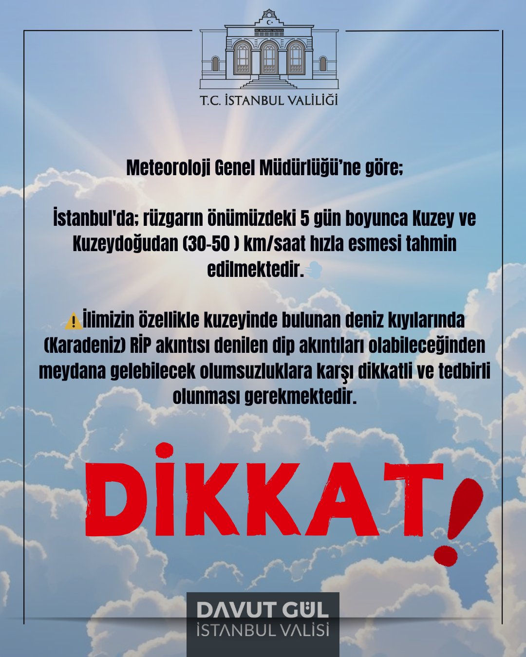 İstanbul Valiliği, kentte rüzgarın 5 gün boyunca kuzey ve kuzeydoğudan kuvvetli şekilde eseceği uyarısında bulundu. İstanbul Valiliği'nin sosyal medya hesabından vatandaşlara uyarıda bulunuldu. İlgili açıklada, “Meteoroloji Genel Müdürlüğü'nün değerlendirmelerine göre İstanbul'da; rüzgarın önümüzdeki 5 gün boyunca Kuzey ve Kuzeydoğudan (30-50 ) km/saat hızla esmesi tahmin edilmektedir.” denildi. İstanbul’un kuzeyinde bulunan deniz kıyılarında (Karadeniz) RİP akıntısı denilen dip akıntıları olabileceğinin bildirildiği açıklamada, meydana gelebilecek olumsuzluklara karşı dikkatli ve tedbirli olunması istendi. Kaynak: Davut Gül - İstanbul Valiliği [news_id:776993]