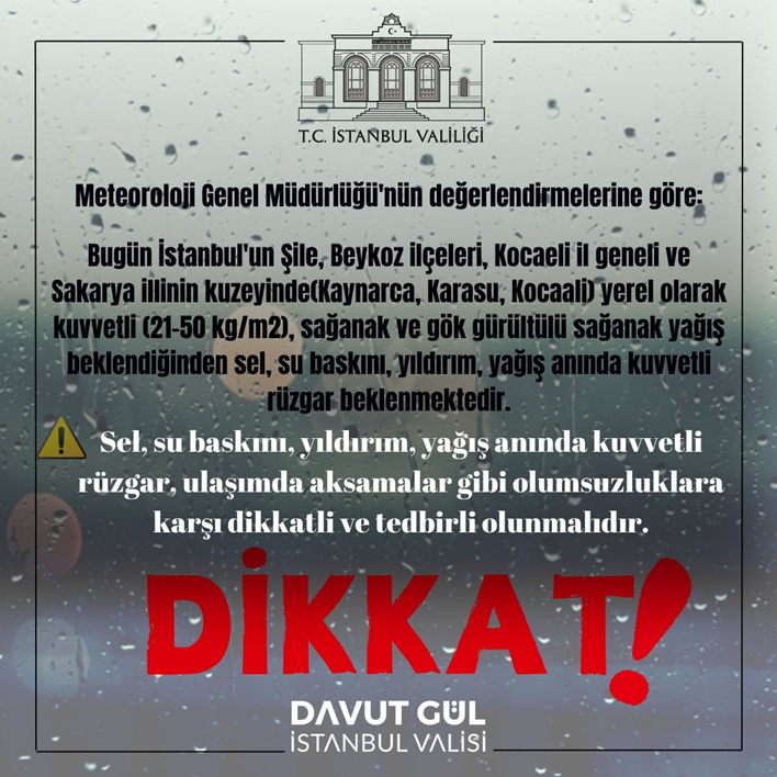 İstanbul Valiliği gök görültülü sağanak beklentisi nedeniyle iki ilçeye yönelik sel ve su baskını uyarısında bulundu. İstanbul Valiliği, Meteoroloji Genel Müdürlüğü’nün değerlendirmelerine dayanarak İstanbul’un Şile ve Beykoz ilçeleri ile Kocaeli ve Sakarya’nın kuzeyinde (Kaynarca, Karasu, Kocaali) kuvvetli sağanak ve gök gürültülü sağanak yağış beklendiğini açıkladı. Yağışların yerel olarak 21-50 kg/m2 arasında olabileceği belirtilirken; sel, su baskını, yıldırım ve yağış anında kuvvetli rüzgâr gibi olumsuzluklara karşı vatandaşların dikkatli ve tedbirli olmasını istedi. Kaynak: İstanbul Valiliği