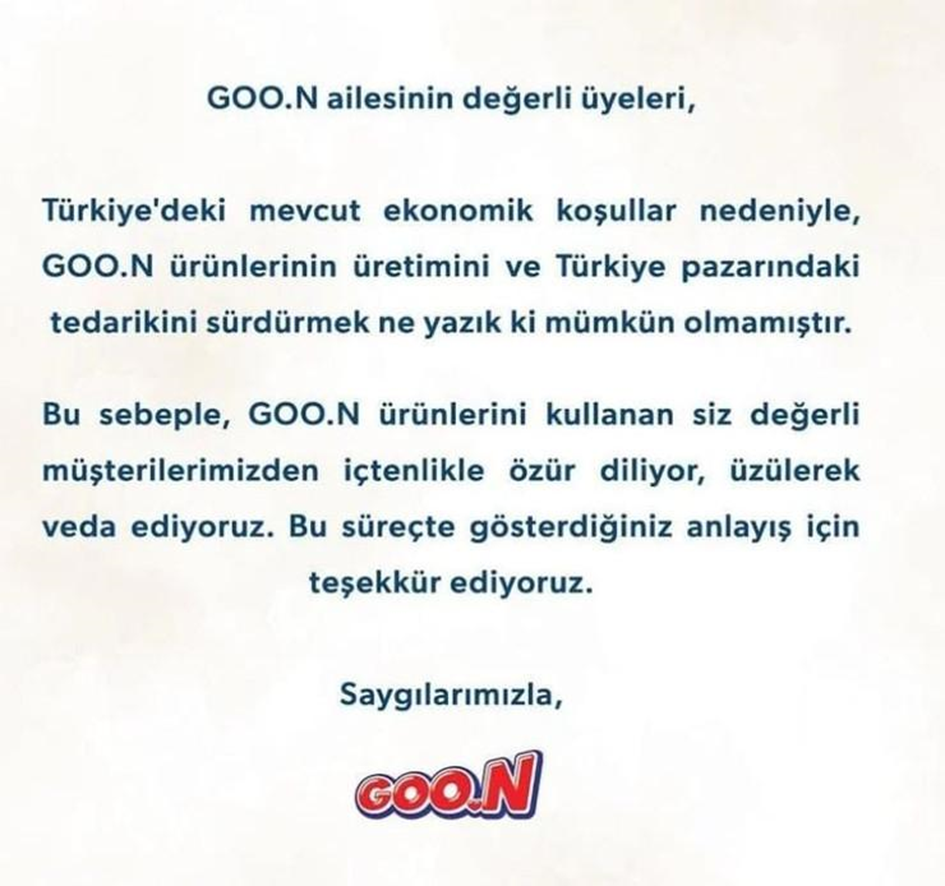 Japonya’nın önde gelen kağıt ve hijyen ürünleri üreticilerinden Daio Paper Corporation, Türkiye'deki faaliyetlerini sonlandırma kararı aldı. Japonya’nın önde gelen kağıt ve hijyen ürünleri üreticilerinden Daio Paper Corporation, Türkiye'den çekilme kararı aldı. Şirketin popüler bebek bezi markası Goo.N, “ülkedeki mevcut ekonomik koşullar” gerekçesiyle Türkiye pazarından çekildiğini resmi sosyal medya hesabı üzerinden duyurdu. Üretim ve tedarik süreçlerinin mevcut ekonomik ortamda sürdürülemez hale geldiği belirtilen açıklamada şunlar aktarıldı: “Türkiye'deki mevcut ekonomik koşullar nedeniyle, GOO.N ürünlerinin üretimi ve Türkiye pazarındaki tedarikini sürdürmek ne yazık ki mümkün olmamıştır. Bu sebeple, GOO.N ürünlerini kullanan siz değerli müşterilerimizden içtenlikle özür diliyor, üzülerek veda ediyoruz.” Kaynak: Goo.N Türkiye [news_id:776523]