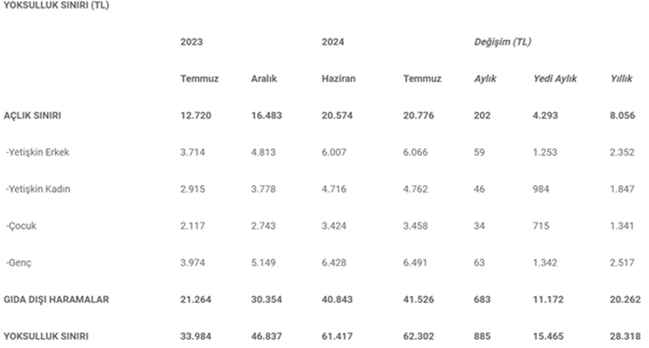 Birleşik Kamu-İş Konfederasyonu Ar-Ge birimi KAMU-AR, temmuz ayına yönelik açlık ve yoksulluk sınırı araştırmasının sonuçlarını paylaştı. Birleşik Kamu-İş Konfederasyonu Ar-Ge birimi KAMU-AR'ın yaptığı araştırmaya göre temmuzda açlık sınırı bir önceki aya göre 202 lira daha artarak 20 bin 776 liraya çıktı. Yoksulluk sınırı ise temmuzda 885 lira artarak 62 bin 302 liraya yükseldi. Böylelikle son bir yılda açlık sınırı 8 bin 56 lira, yoksulluk sınırı da 28 bin 318 lira artış kaydetti. Kaynak: KAMU-AR KAMU-AR’ın dört kişilik bir ailenin, dengeli ve sağlıklı beslenebilmesi için tüketmesi gereken gıda ile beslenmenin yanı sıra diğer temel ihtiyaçlarını da karşılayabilmesi için yapması gereken harcamaları dikkate alarak hesapladığı açlık-yoksulluk sınırı araştırmasına göre açlık sınırı bu yıl sonuna kadar 17 bin 2 lira olarak uygulanacağı kesinleşen asgari ücretin böylelikle 3 bin 774 lira üzerine çıkmış oldu. İlgili araştırma asgari ücretin 62 bin 302 liralık yoksulluk sınırının sadece yüzde 27’sini karşılayabildiğini gösterdi. Araştırmanın sonuçları ayrıca 12 bin 500 liraya çıkarılan en düşük emekli aylığının da açlık sınırının ancak yüzde 60’ını karşıladığına işaret etti. Gıda dışı harcamalar 11 bin 172 lira arttı Yoksulluk sınırının belirlenmesinde gıda dışı gereksinimlerin fiyat değişimleri de esas alınarak yapılan araştırmaya göre, dört kişilik bir ailenin gıda dışındaki gereksinimlerini “yoksunluk hissi duymadan” karşılayabilmesi için gereken harcama tutarı da temmuzda 41 bin 526 liraya kadar çıktı. Temmuzda dört kişinin giyim ve ayakkabı harcamaları bin 945 liraya gerilerken, barınma (kira dâhil) harcamaları 9 bin 865 liraya, ev eşyası harcamaları 5 bin 287 lira, sağlık harcamaları bin 703 lira oldu. Ulaştırma harcamaları 12 bin 4450 liraya indi. Haberleşme harcamaları bin 317 liraya, eğlence ve kültür harcamaları bin 237 liraya, eğitim harcamaları 918 liraya, tatil-otel harcamaları 4 bin 569 liraya ve çeşitli mal ve hizmetlerle ilgili harcamalar 2 bin 235 liraya çıktı. Böylelikle gıda dışı harcamalarda bu yılın ilk yedi aylık döneminde 11 bin 172 lira artış gösterdi. [news_id:740821]