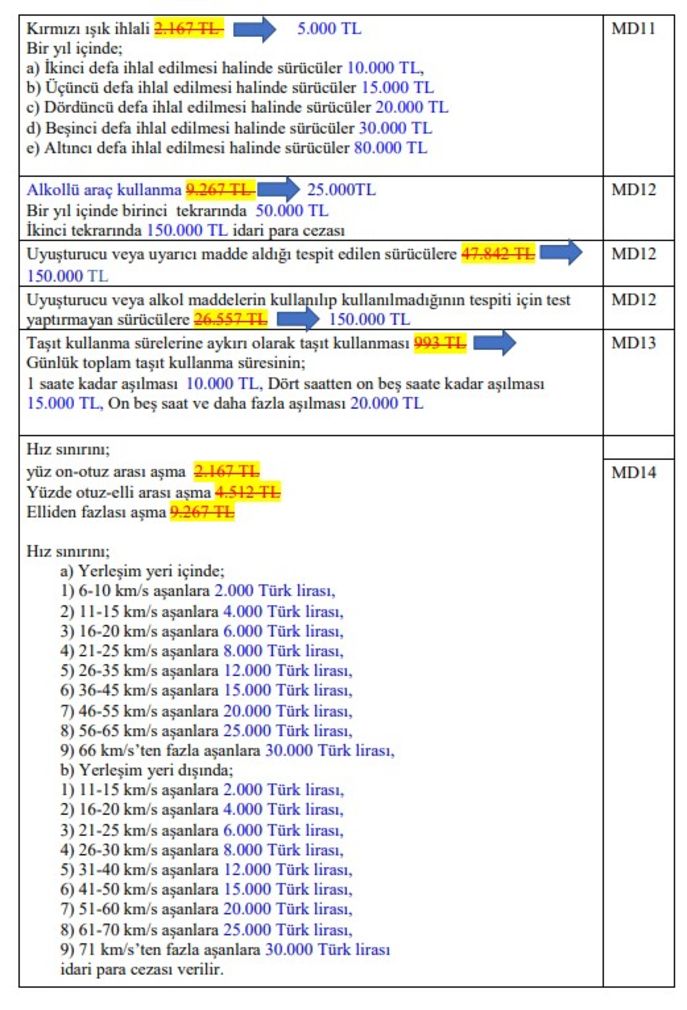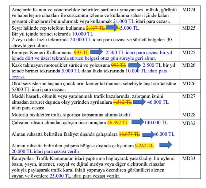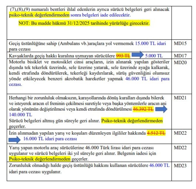 TBMM Adalet Komisyonu, Karayolları Trafik Kanunu'nda değişiklikler yapılmasına ilişkin teklifi görüşerek kabul etti. Kabul edilen teklife göre ehliyeti alınmasına rağmen trafiğe çıkanlara 200 bin TL, trafikte saldırı amacıyla aracından inen sürücülere ise 180 bin lira idari para cezası uygulanacak, sürücü belgeleri 60 gün süreyle geri alınacak ve araçlar 30 gün süreyle trafikten menedilebilecek. TBMM Adalet Komisyonu’nda ölümlü trafik kazalarının azaltılması amacıyla özellikle aşırı hız, kırmızı ışık ve şerit ihlalleri başta olmak üzere birçok ihlalde cezaların ağır oranlarda artırılmasına yönelik Karayolları Trafik Kanunu'nda Değişiklik Yapılmasına Dair Kanun Teklifi kabul edildi. Teklife göre, ehliyetsiz araç kullananlara 40 bin lira, ehliyeti tedbiren geri alındığı veya iptal edildiği halde araç kullananlara 200 bin lira ceza verilecek. Trafikte düğün, asker uğurlama gibi gerekçelerle konvoy yapmak, diğer araçların geçişini zorlaştıracak veya tehlikeye sokacak şekilde keyfi hareketlerde bulunmak yasak olacak. Trafiği aksatacak veya tehlikeye sokacak şekilde makas atanlar, otoyollarda veya karayollarında araçlarını ters istikamette kullananlar, konvoy yapanlar, keyfi olarak araçlarını trafiği engelleyecek şekilde karayolu üzerinde durduranlar 90 bin lira para cezası ödeyecek ve ehliyetleri 60 gün süreyle geri alınacak, araçlar 30 gün süreyle trafikten menedilecek. Trafikte saldırı amacıyla başka bir aracı ısrarla takip eden veya bu amaçla araçtan inen sürücülere 180 bin lira idari para cezası uygulanacak, sürücü belgeleri 60 gün süreyle geri alınacak, araçlar 30 gün süreyle trafikten menedilebilecek. Araçlarını ters istikamette sürdüğü ya da trafikte saldırı amacıyla başka bir aracı ısrarla takip ettiği, saldırı amacıyla araçtan indiği gerekçesiyle sürücü belgeleri geri alınan sürücülerin, ehliyetleri psikoteknik değerlendirmeden geçirilmesinin ardından iade edilecek. Kırımızı ışık ihlalinde cezalar kademeli olarak artacak Kırmızı ışık ihlali yapan sürücülere bu ihlalin tekrarı hallerinde verilecek cezalar kademeli olarak artırılacak. Kırmızı ışık ihlali yapan sürücülere, son ihlalin gerçekleştiği tarihten geriye doğru 1 yıl içinde ikinci defa ihlal edilmesi halinde 10 bin lira, üçüncü defa ihlal edilmesi halinde 15 bin lira, dördüncü defa ihlal edilmesi halinde 20 bin lira, beşinci defa ihlal edilmesi halinde 30 bin lira, altıncı defa ihlal edilmesi halinde 80 bin lira idari para cezası verilecek. Sabit veya seyir halinde yürütülen denetimlerde polislerin uyarı ve işaretlerine rağmen "dur" ikazına uymayarak kaçanlara 200 bin lira idari para cezası uygulanarak sürücü belgeleri 60 gün süreyle geri alınacak ve araç 60 gün süreyle trafikten menedilecek. Kırmızı ışık ihlali yaparak trafik kazasına sebebiyet veren sürücülerin sürücü belgeleri 60 gün süreyle geri alınacak. Sürücü belgesi iptal edilenler tekrar sürücü kursuna gidecek Uyuşturucu veya uyarıcı maddeleri kullanılıp kullanılmadığı ya da alkolün kandaki miktarını tespit amacıyla, kollukça teknik cihazlar veya test kitleri kullanılacak. Yapılan tespit sonucunda, 0.50 promilin üzerinde alkollü olarak araç kullandığı tespit edilen sürücülere verilen idari para cezası 700 liradan 25 bin liraya çıkarılıyor. Alkollü olarak araç kullanma nedeniyle sürücü belgesi geri alınanlara ihlalin ikinci defa gerçekleşmesi halinde uygulanan idari para cezası 877 liradan 50 bin liraya yükseltilecek. Bu sürücüler, ihlalin üç veya daha fazla tekrarı halinde ise 150 bin lira idari para cezasına çarptırılacak. Uyuşturucu veya uyarıcı madde aldığı tespit edilen sürücülere 150 bin lira idari para cezası uygulanacak ve sürücü belgesi iptal edilecek. Bu kişiler hakkında ayrıca Türk Ceza Kanunu hükümleri uygulanacak. Sürücü belgesi iptal edilenlerin tekrar sürücü belgesi alabilmeleri için sürücü kurslarına devam etmeleri ve yapılan sınavlarda başarılı olarak motorlu taşıt sürücüsü sertifikası almaları gerekecek. Kanunun idari yaptırıma bağlayarak yasakladığı bir eylemi basın, yayın, internet, sosyal medya ve diğer elektronik cihazlar yoluyla paylaşarak trafik kural ihlali yapmaya özendiren görüntüleri alenen yaymak ve övmek yasaklanacak. Bu hükme uymayanlara 25 bin lira idari para cezası verilecek. Hız sınırlarına getirilen cezalar artacak Hız ölçen teknik cihaz veya çeşitli teknik usullerle yapılan tespit sonucu yönetmelikte belirlenen hız sınırlarını; yerleşim yeri içinde; 6-10 kilometre/saat ve daha fazla aşanlara 2 bin lira, 11-15 kilometre/saat aşanlara 4 bin lira, 16-20 kilometre/saat aşanlara 6 bin lira, 21-25 kilometre/saat aşanlara 8 bin lira, 26-35 kilometre/saat aşanlara 12 bin lira, 36-45 kilometre/saat aşanlara 15 bin lira, 46-55 kilometre/saat aşanlara 20 bin lira, 56-65 kilometre/saat aşanlara 25 bin lira, 66 kilometre/saatten fazla aşanlara 30 bin lira idari para cezası verilecek. Söz konusu hız sınırlarını, yerleşim yeri dışında 11-15 kilometre/saat aşanlara 2 bin lira, 16-20 kilometre/saat aşanlara 4 bin lira, 21-25 kilometre/saat aşanlara 6 bin lira, 26-30 kilometre/saat aşanlara 8 bin lira, 31-40 kilometre/saat aşanlara 12 bin lira, 41-50 kilometre/saat aşanlara 15 bin lira, 51-60 kilometre/saat aşanlara 20 bin lira, 61-70 kilometre/saat aşanlara 25 bin lira, 71 kilometre/saatten fazla aşanlara 30 bin lira idari para cezası uygulanacak.