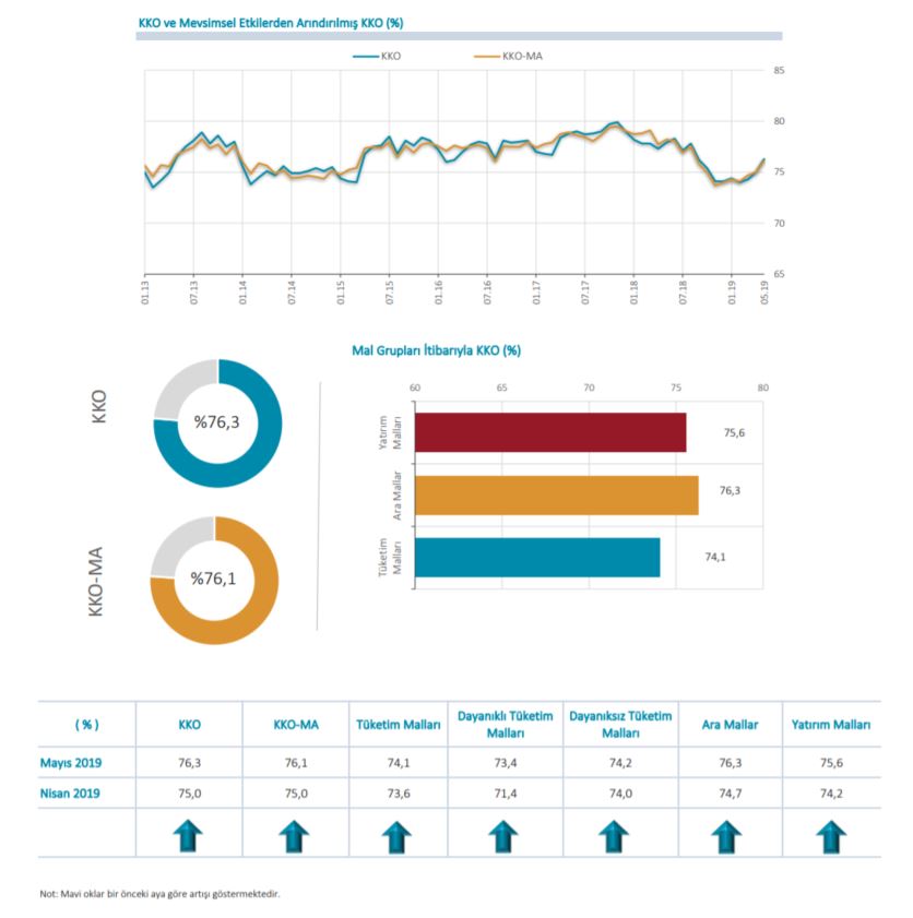 Türkiye Cumhuriyet Merkez Bankası verillerine göre Mayıs ayında kapasite kullanım oranı yüzde 76.3 oranında gerçekleşti. İmalat sanayi kapasite kullanım oranı (KKO), Mayıs ayında bir önceki aya göre 1.3 puan artışla yüzde 76.3 düzeyine ve imalat sanayi genelinde mevsimsel etkilerden arındırılmış kapasite kullanım oranı bir önceki aya göre 1.1 puan artışla yüzde 76.1 düzeyine yükseldi Merkez Bankası verilerine göre, 2019 yılı Mayıs ayında kapasite kullanım oranları, tüm mal gruplarında yükseldi. Merkez Bankası’ndan yapılan açıklamada şu değerlendirme yapıldı: “Endeksi oluşturan anket sorularına ait yayılma endeksleri incelendiğinde, gelecek üç aydaki toplam istihdam miktarı ve mevcut mamul mal stokuna ilişkin değerlendirmeler endeksi artış yönünde etkilerken, genel gidişat, gelecek üç aydaki ihracat sipariş miktarı, gelecek üç aydaki üretim hacmi, sabit sermaye yatırım harcaması, son üç aydaki toplam sipariş miktarı ve mevcut toplam sipariş miktarına ilişkin değerlendirmeler endeksi azalış yönünde etkiledi.”