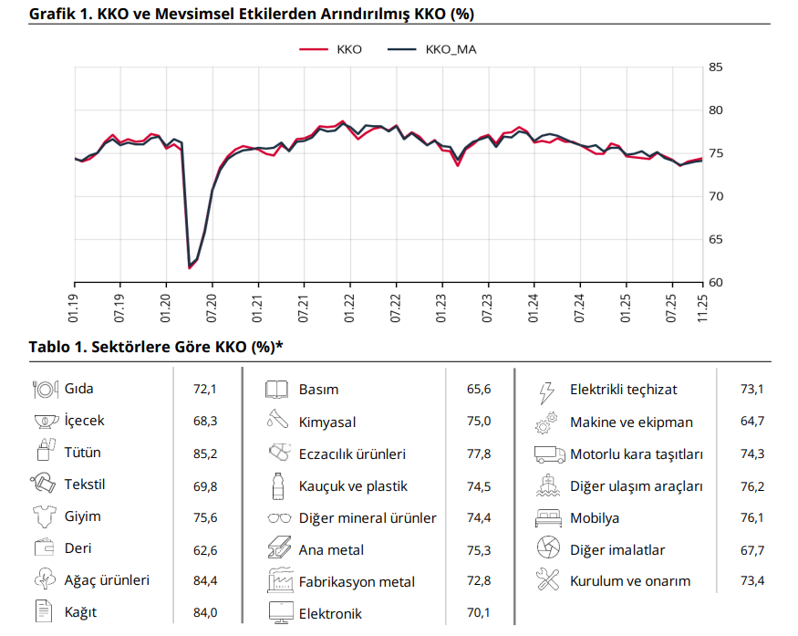 İmalat sanayisi genelinde mevsimsel etkilerden arındırılmamış kapasite kullanım oranı (KKO), kasımda geçen aya göre 0,2 puan artarak yüzde 74,4'e yükseldi. Türkiye Cumhuriyet Merkez Bankası (TCMB), kasım ayına ilişkin İmalat Sanayi KKO verilerini açıkladı. Buna göre, kasım ayında imalat sanayisinde faaliyet gösteren 1791 iş yeri tarafından İktisadi Yönelim Anketi'ne verilen yanıtlar toplulaştırılarak değerlendirildi. İmalat sanayisi genelinde mevsimsel etkilerden arındırılmış KKO, geçen aya göre 0,1 puan artarak yüzde 74,1 oldu. Mevsimsel etkilerden arındırılmamış KKO da kasımda, geçen aya göre 0,2 puan artarak yüzde 74,4'e çıktı. Kaynak: TCMB