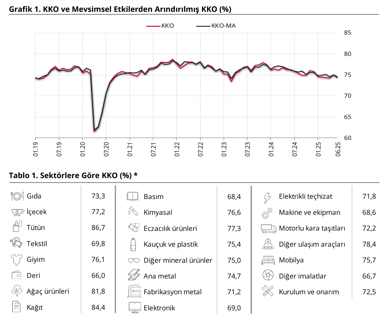 İmalat sanayisi genelinde mevsimsel etkilerden arındırılmamış kapasite kullanım oranı (KKO), haziranda geçen aya göre 0,4 puan azalarak yüzde 74,6'ya geriledi. Türkiye Cumhuriyet Merkez Bankası, haziran ayına ilişkin İmalat Sanayi KKO verilerini açıkladı. Buna göre, haziran ayında imalat sanayinde faaliyet gösteren 1842 iş yeri tarafından İktisadi Yönelim Anketi'ne verilen yanıtlar toplulaştırılarak değerlendirildi. İmalat sanayi genelinde mevsimsel etkilerden arındırılmış KKO, geçen aya göre 0,7 puan azalarak yüzde 74,4 oldu. Mevsimsel etkilerden arındırılmamış KKO, haziranda geçen aya göre 0,4 puan azalarak yüzde 74,6'ya geriledi. Kaynak: TCMB