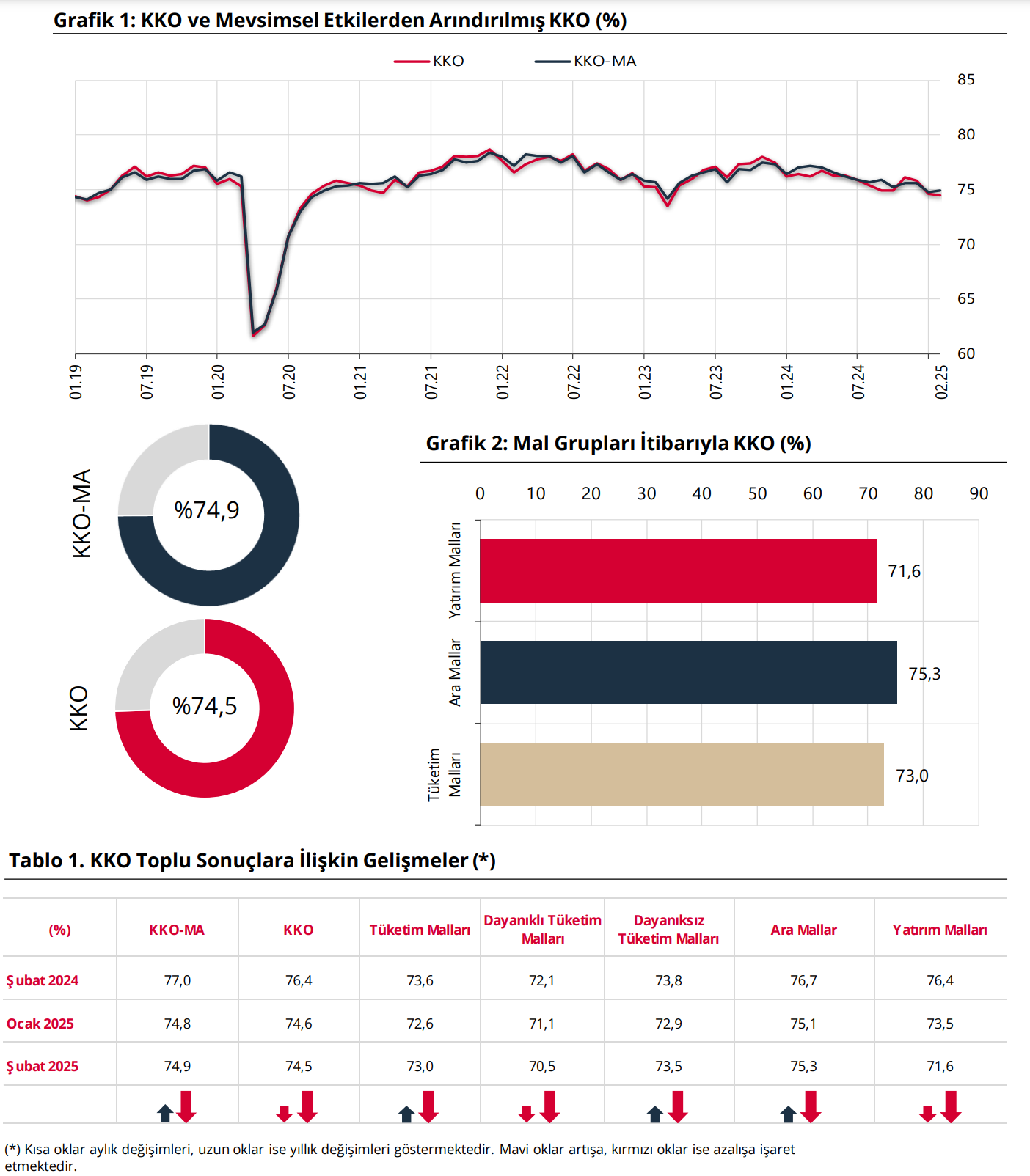 TCMB verilerine göre kapasite kullanım oranı şubatta geçen aya göre 0,1 puan azalarak yüzde 74,5 seviyesine indi. Türkiye Cumhuriyet Merkez Bankasından (TCMB) yapılan açıklamaya göre, imalat sanayisinde faaliyet gösteren 1750 iş yeri tarafından şubat ayı İktisadi Yönelim Anketi'ne verilen yanıtlar toplulaştırılarak değerlendirildi. Anket sonuçlarına göre, imalat sanayisi genelinde kapasite kullanım oranı, şubatta geçen aya oranla 0,1 puan azalarak yüzde 74,5 oldu. Mevsimsel etkilerden arındırılmış kapasite kullanım oranı da (KKO-MA) geçen aya göre 0,1 puan artarak yüzde 74,9'a çıktı. Kaynak: TCMB