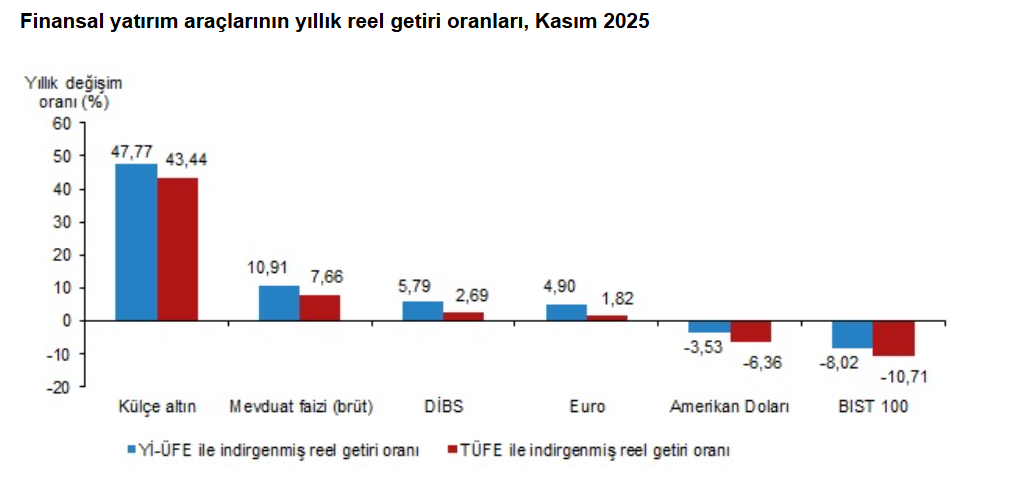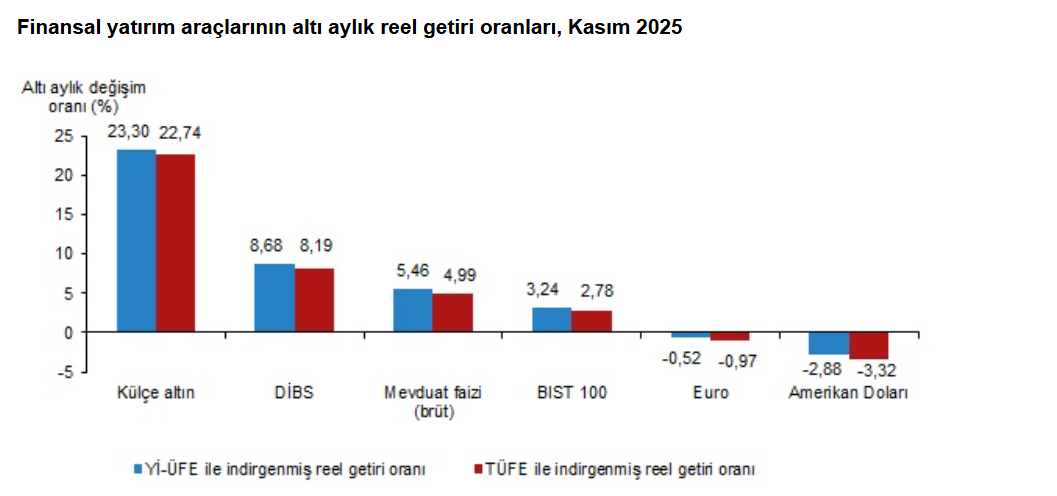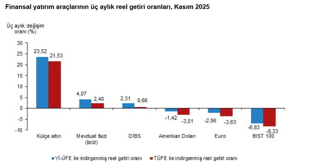 Türkiye İstatistik Kurumu (TÜİK), kasım ayında enflasyon ile indirgendiğinde en yüksek reel getirinin mevduat faizinde gerçekleştiğini hesapladı. Türkiye İstatistik Kurumu (TÜİK), kasım ayına ilişkin finansal yatırım araçlarının reel getiri oranlarını açıkladı. Aylık en yüksek reel getiri, yurt içi üretici fiyat endeksi (Yİ-ÜFE) ile indirgendiğinde %2,21, tüketici fiyat endeksi (TÜFE) ile indirgendiğinde ise %2,18 oranlarıyla mevduat faizi (brüt)'te gerçekleşti. Yİ-ÜFE ile indirgendiğinde; yatırım araçlarından, Devlet İç Borçlanma Senetleri (DİBS) %1,89, BİST 100 endeksi %0,50 ve Amerikan Doları %0,26 oranlarında yatırımcısına reel getiri sağlarken; külçe altın %0,41 ve Euro %0,45 oranlarında yatırımcısına kaybettirdi. TÜFE ile indirgendiğinde ise DİBS %1,86, BİST 100 endeksi %0,47 ve Amerikan Doları %0,23 oranında yatırımcısına reel getiri sağlarken; külçe altın %0,44 ve Euro %0,48 oranlarında yatırımcısına kaybettirdi. Külçe altın, üç aylık değerlendirmede; Yİ-ÜFE ile indirgendiğinde %23,52, TÜFE ile indirgendiğinde ise %21,53 oranlarında yatırımcısına en yüksek reel getiri sağlayan yatırım aracı oldu. Aynı dönemde BİST 100 endeksi; Yİ-ÜFE ile indirgendiğinde %6,83, TÜFE ile indirgendiğinde ise %8,33 oranlarında yatırımcısına en çok kaybettiren yatırım aracı oldu. Altı aylık değerlendirmeye göre külçe altın; Yİ-ÜFE ile indirgendiğinde %23,30, TÜFE ile indirgendiğinde ise %22,74 oranlarında yatırımcısına en yüksek reel getiri sağlayan yatırım aracı olurken; aynı dönemde Amerikan Doları, Yİ-ÜFE ile indirgendiğinde %2,88, TÜFE ile indirgendiğinde ise %3,32 oranlarında yatırımcısına en çok kaybettiren yatırım aracı oldu. Yıllık değerlendirmede en yüksek reel getiri külçe altında Finansal yatırım araçları yıllık olarak değerlendirildiğinde külçe altın; Yİ-ÜFE ile indirgendiğinde %47,77, TÜFE ile indirgendiğinde ise %43,44 oranlarında yatırımcısına en yüksek reel getiri sağlayan yatırım aracı oldu. Yıllık değerlendirmede, Yİ-ÜFE ile indirgendiğinde; yatırım araçlarından mevduat faizi (brüt) %10,91, DİBS %5,79, Euro %4,90 oranlarında yatırımcısına reel getiri sağlarken; Amerikan Doları %3,53 ve BIST 100 endeksi %8,02 oranlarında yatırımcısına kaybettirdi. TÜFE ile indirgendiğinde ise mevduat faizi (brüt) %7,66, DİBS %2,69 ve Euro %1,82 oranında yatırımcısına reel getiri sağlarken; Amerikan Doları %6,36 ve BIST 100 endeksi %10,71 oranlarında yatırımcısına kaybettirdi. [news_id:794325] [news_id:792304] [news_id:794328]