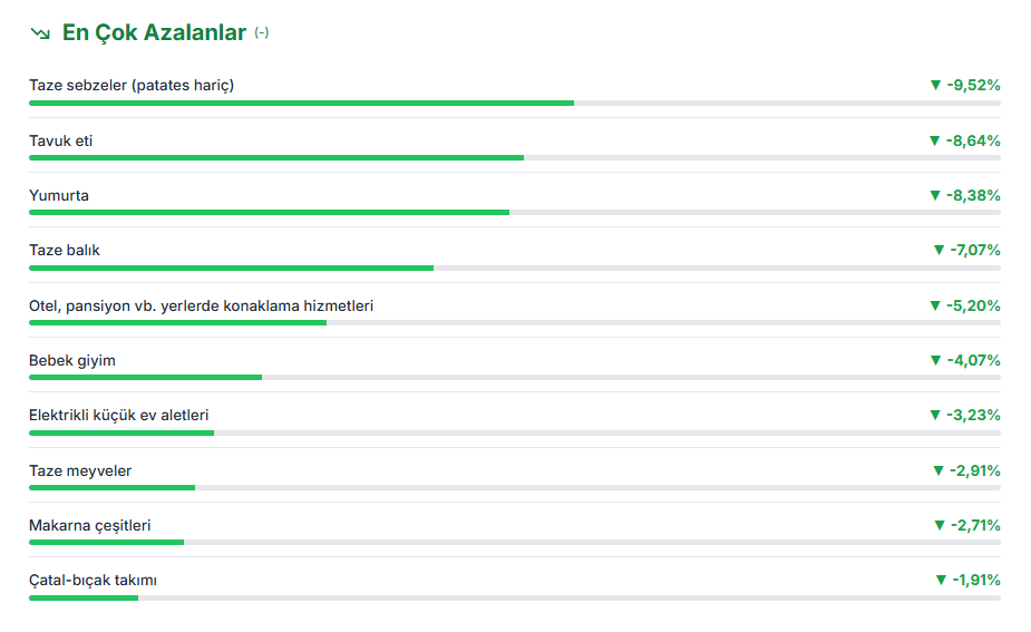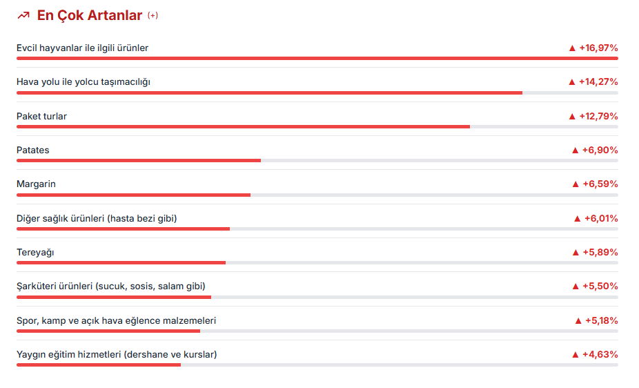 Kasım ayı enflasyon rakamlarının açıklanmasının ardından tüketici fiyatları bazında en yüksek fiyat artışı ve en yüksek fiyat düşüşü gerçekleşen ürünler de belli oldu. Türkiye İstatistik Kurumu, kasım ayında enflasyonun aylık yüzde 0,87, yıllık ise 31,07 artış kaydettiğini açıkladı. Tüketici fiyatları bazında kasımda en yüksek fiyat artışı yüzde 16,97 ile evcil hayvanlarla ilgili ürünlerde gerçekleşti. TÜİK verilerine göre, evcil hayvanlarla ilgili ürünlerdeki fiyat artışını 14,27 ile hava yoluyla yolcu taşımacılığı ve 12,79 ile paket turlar izledi. Kasımda fiyatı en çok artış gösteren diğer ürünler arasında, yüzde 6,9 ile patates, yüzde 6,59 ile margarin, yüzde 6,01 ile diğer sağlık ürünleri (hasta bezi gibi) ve yüzde 5,89 ile tereyağı yer aldı. En çok ucuzlayan ürünler Kasım ayında en fazla fiyat düşüşü ise yüzde 9,52 ile taze sebzelerde (patates hariç) gerçekleşti. Bunu yüzde 8,64 ile tavuk eti, yüzde 8,38 ile yumurta, yüzde 7,07 ile taze balık, yüzde 5,2 ile otel, pansiyon gibi yerlerde konaklama hizmetleri takip etti. TÜİK'in tüketici fiyatları endeksine göre kasımda aylık bazda fiyatları en fazla artan ürünler ile bunların bir önceki aya göre değişim oranları şöyle oldu: Kasımda fiyatı en fazla düşen seçilmiş maddeler ile bir önceki aya göre değişim oranları ise şöyle sıralandı: [news_id:793827]