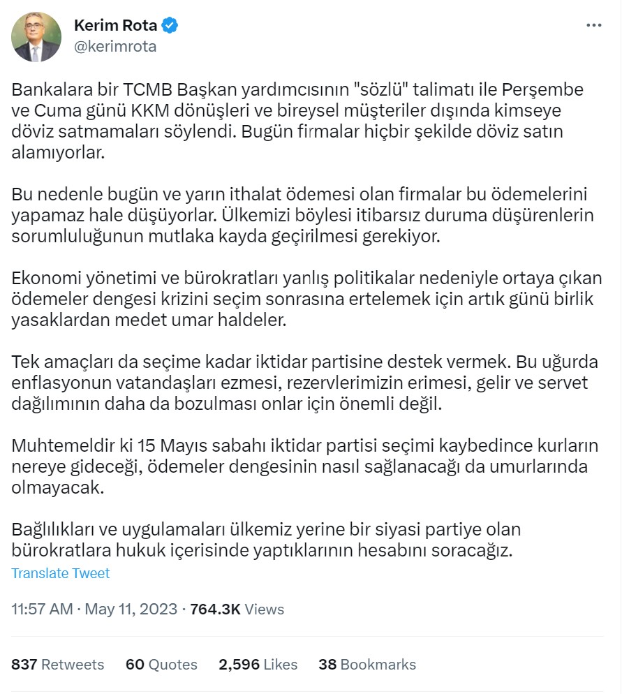 Gelecek Partisi Ekonomi Politikaları Başkanı Kerim Rota, bir TCMB Başkan Yardımcısı'nın 'sözlü' talimat ile bankalara perşembe ve cuma günü KKM dönüşleri ve bireysel müşteriler dışında döviz satmamalarını söylediğini aktardı. Kerim Rota, Twitter paylaşımında konuyla ilgili şunları kaydetti: "Bankalara bir TCMB Başkan Yardımcısı'nın "sözlü" talimatı ile perşembe ve cuma günü KKM dönüşleri ve bireysel müşteriler dışında kimseye döviz satmamaları söylendi. Bugün firmalar hiçbir şekilde döviz satın alamıyorlar. Bu nedenle bugün ve yarın ithalat ödemesi olan firmalar bu ödemelerini yapamaz hale düşüyorlar. Ülkemizi böylesi itibarsız duruma düşürenlerin sorumluluğunun mutlaka kayda geçirilmesi gerekiyor. Ekonomi yönetimi ve bürokratları yanlış politikalar nedeniyle ortaya çıkan ödemeler dengesi krizini seçim sonrasına ertelemek için artık günü birlik yasaklardan medet umar haldeler. Tek amaçları da seçime kadar iktidar partisine destek vermek. Bu uğurda enflasyonun vatandaşları ezmesi, rezervlerimizin erimesi, gelir ve servet dağılımının daha da bozulması onlar için önemli değil. Muhtemeldir ki 15 Mayıs sabahı iktidar partisi seçimi kaybedince kurların nereye gideceği, ödemeler dengesinin nasıl sağlanacağı da umurlarında olmayacak. Bağlılıkları ve uygulamaları ülkemiz yerine bir siyasi partiye olan bürokratlara hukuk içerisinde yaptıklarının hesabını soracağız." Kaynak: Kerim Rota - Twitter
