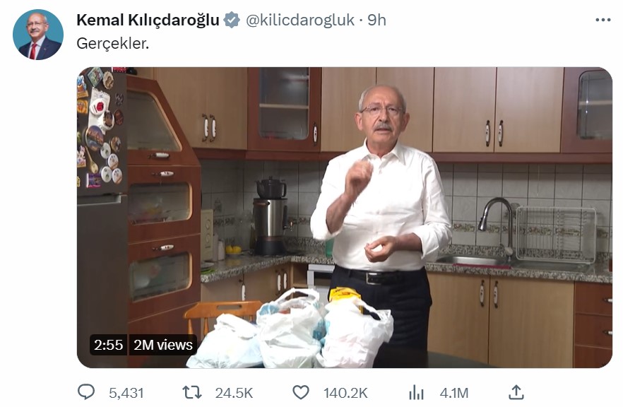 Cumhurbaşkanı adayı Kılıçdaroğlu, sosyal medyadan paylaştığı videoda, "Önümüzdeki ay ilk çözmemiz gereken mesele sofranıza koyacağınız yemektir.” dedi. Millet İttifakı Cumhurbaşkanı adayı ve CHP Genel Başkanı Kemal Kılıçdaroğlu, Twitter hesabından “Gerçekler” notuyla bir video paylaştı. Kılıçdaroğlu mutfağından çektiği videoda, marketten aldığı temel gıda ürünlerinin geçen yılki fiyatlarıyla bu yılki fiyatlarını karşılaştırdı. Hayat pahalılığını gıda ürünlerinde yaşanan fiyat değişimiyle anlatan Kılıçdaroğlu, şunları söyledi: “Önümüzdeki ay ilk çözmemiz gereken mesele sofranıza koyacağınız yemektir. Çocuklarınızın ihtiyaçlarını karşılamaktır. Peki siz bu radikallerden oluşan koalisyonun bu meseleleri umursadığını hiç gördünüz mü? Mutfağınızda kıyamet kopuyor, marketler, pazarlar yangın yeri. Fakirin payına ise cehennem düştü. Saraylılar aylardır size laf salatası yapıyorlar. İki yakanızı bir araya getirmeye, her çalıştığınızda Erdoğan gelip gömleğinizin yakasından bir düğmeyi daha koparıyor. ‘Bunu neden yaptın?’ sorusunu sorduğunuzda da yanıt vermek yerine size hamaset satıyor. Ordunun gemisini sergiliyor, sorumsuzluk bu. “Sadece soğan ya da et değil. Her şey pahalı” Bakın, sadece soğan ya da et değil. Her şey pahalı. Artık tasarruf edecek yer kalmadı. Biz göreve gelir gelmez ilk iş önce tarladaki, sonra mutfaktaki yangını söndüreceğiz. Bakın, çok sık alışveriş yaptığınız indirim marketten insanımızın en çok aldığı gıda ürünlerini aldım. Size bir sene önceki fiyatını ve bu sabahki fiyatını söyleyeceğim. 1 kilo pirinç aldık. Geçen sene 18 lira, bugün 39 lira. 1 kilo pirinç. 4 kişilik aileye kaç öğün gider biliyor musunuz? Tabii siz biliyorsunuz da saraydakiler gerçek insanların nasıl yaşadığını bilmezler. 1 kilo kuru fasulye var burada. Geçen sene 17 lira, bugün 36 lira vermişiz. Toz şeker. Geçen sene 20 liraya alabildiğimiz şeker bugün tam 47 lira. 1 litre süt. Geçen sene 14, bugün 27 lira. “Beyaz peynir geçen sene 28 lira, bugün 75 lira” 750 gram yoğurt. Geçen sene 12 lira, biz bugün bu yoğurda 28 lira para verdik. 1 kilo çay. Geçen sene 41 liraya alıyorduk. Biz bugün bu çaya 76 lira 50 kuruş ödedik. 1 kilo domates aldık. Geçen sene 12 lira, bugün bu domatese tam 20 lira para ödedik. 400 gram kuşbaşı aldık. Geçen sene 55 liraydı, bugün 92 lira. Bir kalıp beyaz peynir de aldık. Geçen sene 28 lira, bugün bunun fiyatı 75 lira. 1 kavanoz salça. Geçen sene 21 lira, bugün 36 lira. Sevgili halkım. Biz gelmek zorundayız ki süt bu senenin sonuna kadar 50 lira olmasın. Biz gelmek zorundayız ki bir kalıp peynir bu sene sonuna kadar 125 lira olmasın. 1 kilo çay 110 lira olmasın. Kalın sağlıcakla.” Kaynak: Kemal Kılıçdaroğlu - Twitter