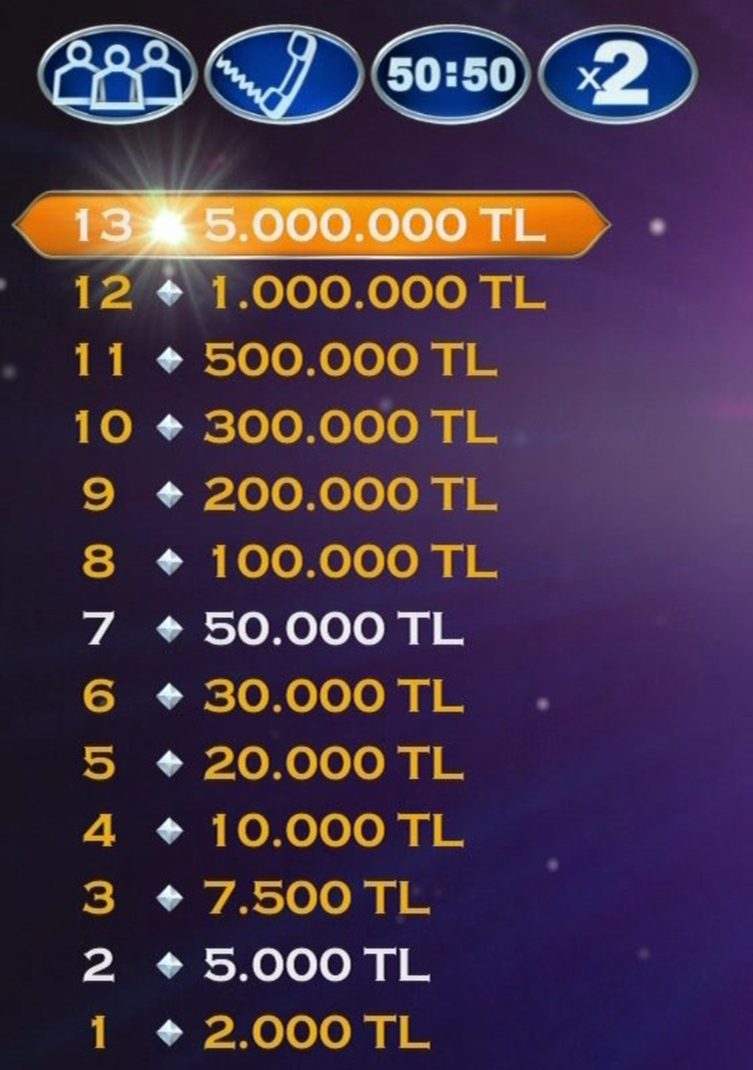 Kim Milyoner Olmak İster yarışmasında bu sezon büyük ödülün artırılacağı bildirildi. Peki, yeni sezonda ödül tutarları nasıl olacak? İşte detaylar.. Bilgi yarışması Kim Milyoner Olmak İster, para ağacını yeniledi. Sabah’ın aktardığına göre, atv ekranlarında yayımlandığı ilk günden beri ilgiyle takip edilen yarışma programı, bu sezon para ödüllerini artırdı. En yüksek para ödülünün 5 milyon TL'ye yükseldiği yarışmaya, bu meblağ için 13. soru ilave edildi. Yarışmada ayrıca diğer soruların para değerleri de yükseltildi. Artan ödül miktarlarının ardından yeni para ağacı ise şu şekilde olacak; Kaynak: Sabah
