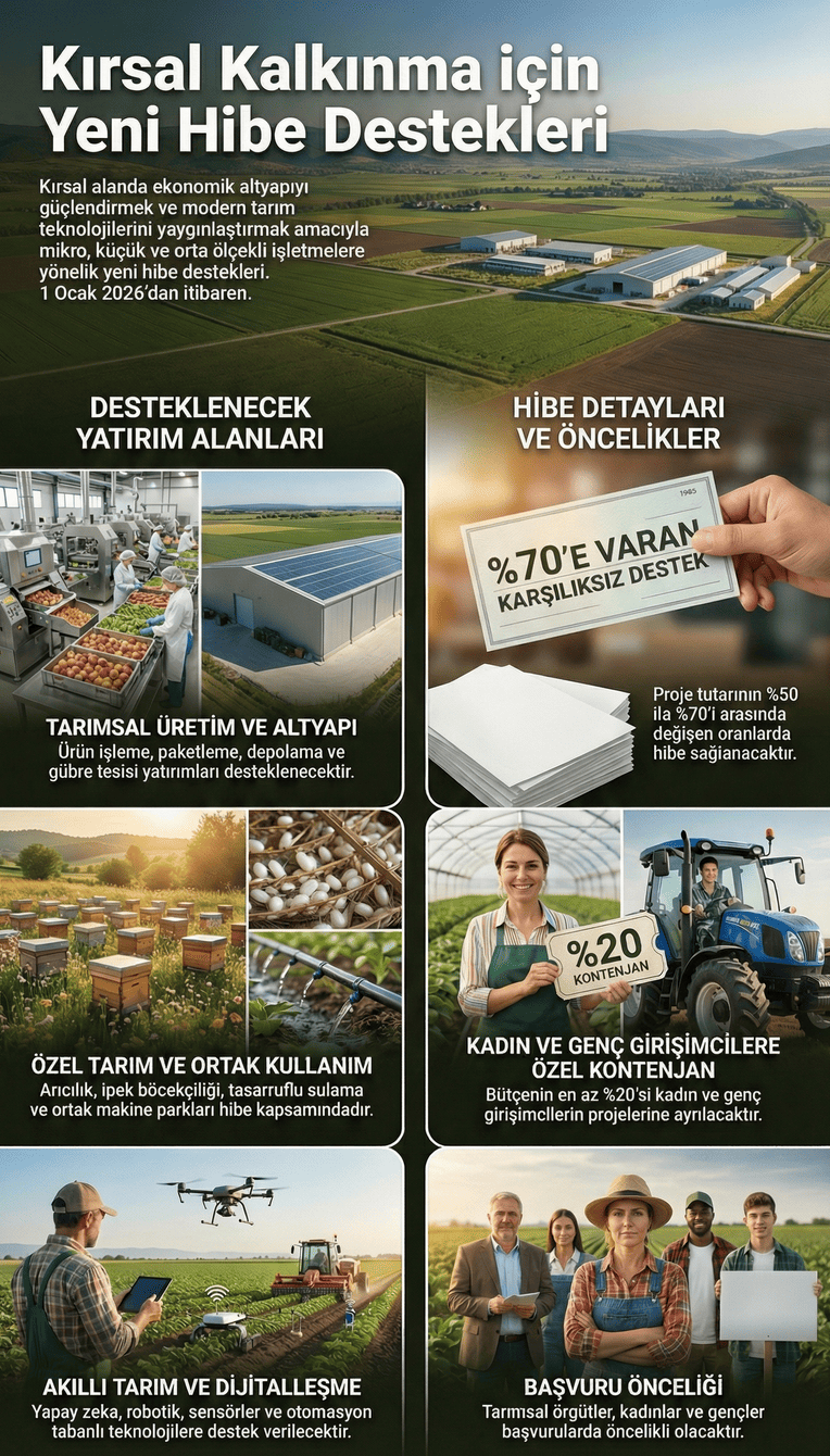 Kırsal kalkınma yatırımlarına yönelik yeni hibe desteklerinin usul ve esasları belirlenerek Resmi Gazete'de yayımlandı. Mikro, küçük ve orta ölçekli işletmelerin desteklenmesini hedefleyen Kırsal Kalkınma Desteklerine İlişkin Cumhurbaşkanı Kararı, Resmi Gazete'nin mükerrer sayısında yer aldı. 1 Ocak 2026 tarihi itibarıyla yürürlüğe girecek olan düzenleme, kırsal alanda alternatif gelir kaynaklarının oluşturulmasını ve ekonomik altyapının güçlendirilmesini amaçlıyor. Karar ile tarımsal faaliyetlerde yeni teknolojilerin yaygınlaştırılması, veri temelli üretim ve akıllı tarım uygulamalarına yönelik yatırımların desteklenmesi planlanıyor. Hibe desteği sağlanacak yatırım alanları Yeni düzenleme kapsamında geniş bir yelpazede yatırım projelerine destek sağlanacak. Tarımsal ürünlerin işlenmesi, paketlenmesi ve depolanması ile hayvansal ve bitkisel menşeli gübre tesislerine yönelik yatırımlar hibe kapsamına alındı. Ayrıca tarımsal amaçlı örgütler için ortak makine parkları, arıcılık faaliyetleri, ipek böceği yetiştiriciliği ve tasarruflu sulama sistemleri de desteklenecek projeler arasında bulunuyor. Dijitalleşme odağında ise sensör ve nesnelerin interneti tabanlı akıllı tarım sistemleri, yapay zeka destekli karar mekanizmaları, robotik ve otomasyon teknolojileri hibe desteğinden faydalanabilecek. Kadın ve genç girişimcilere özel kontenjan Kırsal kalkınma destekleri çerçevesinde, hibeye esas proje tutarı üst limitinin yüzde 50'si ile yüzde 70'i arasında değişen oranlarda karşılıksız destek sunulacak. Program için ayrılan bütçenin en az yüzde 20'lik dilimi, kadın ve genç girişimciler tarafından hayata geçirilecek yatırımlara tahsis edilecek. Birinci derece tarımsal amaçlı örgütlerin, kadınların ve gençlerin başvurularına öncelik tanınacak. Kamu kurum ve kuruluşları ile kamu kaynaklı finansman sağlayan gerçek veya tüzel kişiler bu hibe programından yararlanamayacak.