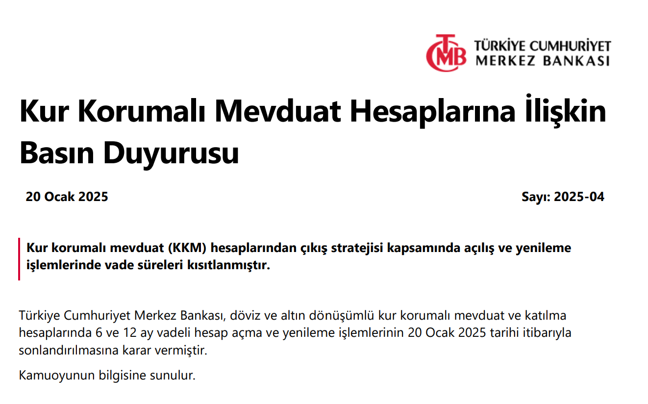 Türkiye Cumhuriyet Merkez Bankası (TCMB), Kur korumalı mevduat (KKM) hesaplarında açılış ve yenileme işlemlerinde vade sürelerini kısıtladı. Türkiye Cumhuriyet Merkez Bankası (TCMB), kur korumalı mevduat hesaplarına ilişkin olarak yeni karar aldı. Bu kapsamda TCMB, döviz ve altın dönüşümlü kur korumalı mevduat (KKM) ve katılma hesaplarında 6 ve 12 ay vadeli hesap açma ve yenileme işlemlerini sonlandırdı. TCMB'den yapılan açıklamada, KKM hesaplarından çıkış stratejisi kapsamında açılış ve yenileme işlemlerinde vade sürelerinin kısıtlandığı bildirildi. Açıklamada, "Türkiye Cumhuriyet Merkez Bankası, döviz ve altın dönüşümlü kur korumalı mevduat ve katılma hesaplarında 6 ve 12 ay vadeli hesap açma ve yenileme işlemlerinin 20 Ocak 2025 tarihi itibarıyla sonlandırılmasına karar vermiştir." ifadelerine yer verildi. Kaynak: TCMB [news_id:759529]