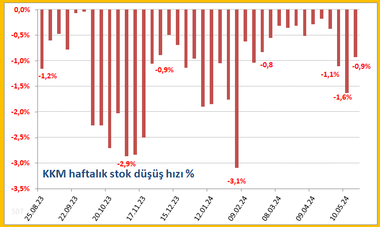 Kur korumalı mevduat hesaplarından geçen hafta 20 milyar 382 milyon liralık çıkış yaşandı. Bu rakam ise haftalık KKM düşüş hızının yavaşladığına işaret etti.. Bankacılık Düzenleme ve Denetleme Kurulu, Kur Korumalı Mevduat hesaplarına ilişkin verileri açıkladı. BDDK'nın verilerine göre geçen hafta KKM hesaplarından 20 milyar 382 milyon liralık çıkış yaşandı. Böylece Kur korumalı mevduatta toplam meblağ 2 trilyon 196 milyar 417 milyon liradan 2 trilyon 176 milyar 35 milyon liraya geriledi. KKM hesaplarından çıkış sürerken haftalık bazlı stok düşüş hızının ise yüzde 1,6’dan yüzde 0,9’a gerilediği görüldü. Kaynak: e507 - X