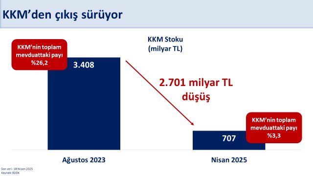 Hazine ve Maliye Bakanı Mehmet Şimşek, makro finansal istikrarı güçlendiren politikalar sayesinde Kur Korumalı Mevduattan (KKM) çıkışın kesintisiz sürdüğünü belirterek, "KKM'nin toplam mevduat içindeki payı 23 puan düşerek yüzde 3,3 oldu." ifadesini kullandı. Bakan Şimşek, sosyal medya hesabından yaptığı paylaşımda, KKM'ye dair son verileri değerlendirdi. KKM'deki azalışa dikkati çeken Şimşek, şunları kaydetti: "Makro finansal istikrarı güçlendiren politikalarımız sayesinde KKM'den çıkış kesintisiz sürüyor. 2023 yılı Ağustos ayına göre stok 2,7 trilyon lira azalarak 707 milyar liraya geriledi. KKM'nin toplam mevduat içindeki payı 23 puan düşerek yüzde 3,3 oldu." Kaynak: Mehmet Şimşek [news_id:768874]