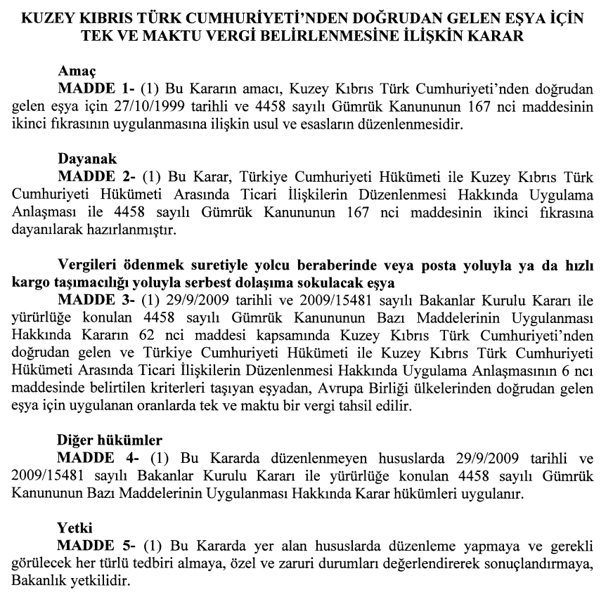 Resmi Gazete’de yayımlanan karar ile KKTC'den gelen eşyadan, Avrupa Birliği ülkelerinden doğrudan gelen eşya için uygulanan oranlarda tek ve maktu bir vergi tahsil edilecek. Kuzey Kıbrıs Türk Cumhuriyeti'nden (KKTC) getirilen eşyalara yönelik vergi oranlarında yeni bir düzenleme yapıldı. Buna göre KKTC'den doğrudan gelen ve Türkiye ile KKTC arasında Ticari İlişkilerin Düzenlenmesi Hakkında Uygulama Anlaşmasının 6. maddesinde belirtilen kriterleri taşıyan eşyadan, AB ülkelerinden doğrudan gelen eşya için uygulanan oranlarda tek ve maktu bir vergi tahsil edilecek. Bugün itibarıyla yürürlüğe giren kararın hükümlerini ise Ticaret Bakanı yürütecek. Konuyla ilgili Resmi Gazete kararı şöyle: MADDE 1- (1) Bu Kararın amacı, Kuzey Kıbrıs Türk Cumhuriyeti'nden doğrudan gelen eşya için 27/10/1999 tarihli ve 4458 sayılı Gümrük Kanununun 167 nci maddesinin ikinci fıkrasının uygulanmasına ilişkin usul ve esasların düzenlenmesidir. MADDE 2- (1) Bu Karar, Türkiye Cumhuriyeti Hükümeti ile Kuzey Kıbrıs Türk Cumhuriyeti Hükümeti Arasında Ticari İlişkilerin Düzenlenmesi Hakkında Uygulama Anlaşması ile 4458 sayılı Gümrük Kanununun 167 nci maddesinin ikinci fıkrasına dayanılarak hazırlanmıştır. Vergileri ödenmek suretiyle yolcu beraberinde veya posta yoluyla ya da hızlı kargo taşımacılığı yoluyla serbest dolaşıma sokulacak eşya MADDE 3- (1) 29/9/2009 tarihli ve 2009/15481 sayılı Bakanlar Kurulu Kararı ile yürürlüğe konulan 4458 sayılı Gümrük Kanununun Bazı Maddelerinin Uygulanması Hakkında Kararın 62 nci maddesi kapsamında Kuzey Kıbrıs Türk Cumhuriyeti'nden doğrudan gelen ve Türkiye Cumhuriyeti Hükümeti ile Kuzey Kıbrıs Türk Cumhuriyeti Hükümeti Arasında Ticari İlişkilerin Düzenlenmesi Hakkında Uygulama Anlaşmasının 6 ncı maddesinde belirtilen kriterleri taşıyan eşyadan, Avrupa Birliği ülkelerinden doğrudan gelen eşya için uygulanan oranlarda tek ve maktu bir vergi tahsil edilir. MADDE 4- (1) Bu Kararda düzenlenmeyen hususlarda 29/9/2009 tarihli ve 2009/15481 sayılı Bakanlar Kurulu Kararı ile yürürlüğe konulan 4458 sayılı Gümrük Kanununun Bazı Maddelerinin Uygulanması Hakkında Karar hükümleri uygulanır. MADDE 5- (1) Bu Kararda yer alan hususlarda düzenleme yapmaya ve gerekli görülecek her türlü tedbiri almaya, özel ve zaruri durumları değerlendirerek sonuçlandırmaya, Bakanlık yetkilidir. MADDE 6- (1) Bu Karar yayımı tarihinde yürürlüğe girer. MADDE 7- (1) Bu Karar hükümlerini Ticaret Bakanı yürütür. Kaynak: Resmi Gazete [news_id:754025]
