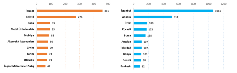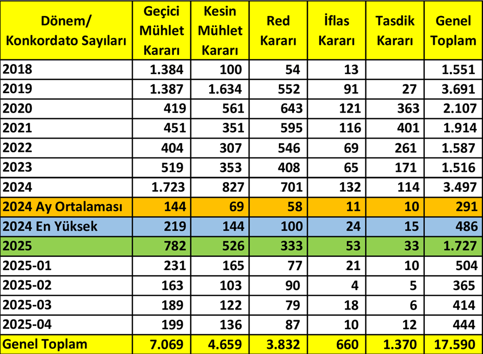 Sıkı para koşullarının yol açtığı finansmana erişimde yaşanan tıkanıklık sonrası nisan ayında şirketlerin konkordato talebi bir önceki yılın iki katını aştı. Konkordato Takip platformunun verilerine göre nisan ayında 444 şirket konkordato talebinde bulundu. Bunların 10’u iflas ederken 199’una geçici mühlet, 136’sına ise kesin mühlet verildi. Konkordato yılı olarak tanımlanan 2024’ün aynı ayında ise konkordato başvurusunda bulunan şirket sayısı 214 olmuştu. Böylelikle konkordato talebinin bir önceki yıla kıyasla ikiye katlandığı görüldü. Yılın ilk dört aylık verilerine bakıldığında ise konkordato talebinde bulunan şirket sayısının 1727’ye ulaştığı ortaya çıktı. Mahkemeler bu şirketlerden 1308’ine geçici ya da kesin mühlet kararı verirken iflas kararı verilen dosya sayısı da 53 oldu. 2024’ün ilk dört ayında başvuru sayısı 706, iflas kararı verilen şirket sayısı ise 35 olarak belirlenmişti. Kaynak: Konkordatotakip En riskli sektörler belli oldu Konkordato talebinde bulunan şirketlerin sektörel dağılıma bakıldığında ise 2025’in en kırılgan sektörünün inşaat olduğu görüldü. 461 şirketle listenin başında yer alan inşaatı, 276 başvuruyla tekstil ve 93 başvuruyla gıda ve metal ürün imalatı takip etti. 2024’te konkordato rekoru tekstil sektöründe gerçekleşmişti. Öte yandan ilgili veriler, ekonomik darboğazın en çok büyükşehirlerde hissedildiğini ortaya koydu. Buna göre en çok konkordato alan illerin başında 1061 ile İstanbul, 511 ile Ankara, 180 ile İzmir geldi. Bu illeri sırasıyla Kocaeli, Bursa, Antalya, Tekirdağ, Konya, Denizli ve Balıkesir izledi. Kaynak: Konkordatotakip [news_id:769226] [news_id:759039]