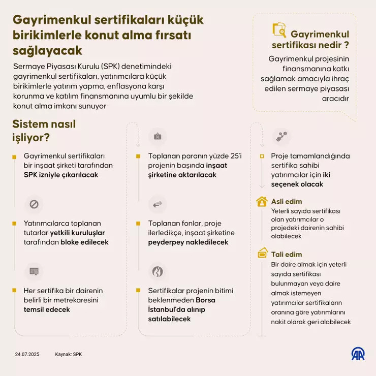 Bakan Kurum, Emlak Konut GYO ile TOKİ'nin iş birliğinde hayata geçirilecek gayrimenkul sertifikasının halka arz fiyatının değerleme fiyatı üzerinden yüzde 25 indirimle 7 lira 59 kuruş olarak belirlendiğini açıkladı. Çevre, Şehircilik ve İklim Değişikliği Bakanı Murat Kurum, TOKİ ve Emlak Konut GYO ortaklığıyla hayata geçirilecek, konut edinmeyi kolaylaştıran ve herkesin gayrimenkul yatırımına adım atabilmesini sağlayacak yeni bir finansman modeli olan "Gayrimenkul Sertifikası"nın tanıtım programında konuştu. Bakan Kurum'un konuşmasından öne çıkanlar şunlar oldu: “Yıl sonunda yeni sosyal konut projesini başlatıyoruz. Cumhuriyet tarihinin en büyük sosyal konut projesini Cumhurbaşkanımız yıl sonuna kadar milletimizle paylaşacak. 81 ilde konut ve kira fiyatlarının düşeceğini göreceğiz. Ankara, İzmir ve İstanbul'da yaşanan konut darlığının ortadan kalkacağını göreceğiz. Ülkemizin de yer aldığı bu coğrafyada çatışmalar artarak devam ediyor. Tüm bunların yanında 6 Şubat depremleri gibi afetler konut piyasasındaki baskıyı artırıyor. Özellikle büyük şehirlerde fiyatlar artıyor, vatandaşın konuta erişimi zorlaşıyor. Bugün Gayrimenkul Sertifikası'nı sizlere tanıyoruz. Yeni konut ve arsa arzlarıyla sorunları kökten çözeceğiz. 81 ilimizi hem afetlere hazırlayacağız, hem de yapılması gerekenleri milletimizle el ele vererek hayata geçireceğiz. Gayrimenkul Sertifikası, bir yatırım aracıdır. Gayrimenkul projelerine küçük paylarla ortak olabileceksiniz. Hisse senedi gibi alınıp satılabilen bir şeydir. Bu sistemin en güzel yanı biriminiz az olsa bile cüzi miktarlarda yatırım yaparak alabiliyorsunuz. Projede yeterli sayıya ulaştığınızda o projeden ev sahibi olabiliyorsunuz ya da nakde çevirebileceksiniz. Mesela hayalinizdeki ev için yeterli sertifikaya ulaştınız, projede size istediğiniz konut ayrılıyor ve projeden konutunuzu alabiliyorsunuz. İki veya daha fazla kişi sertifikalarını birleştirebiliyor. Borsa İstanbul'da işlem gördüğü için istediğinizde alıp satabileceksiniz. Satış emri verdiğinizde Borsa İstanbul'daki fiyat üzerinden satılabiliyor. ilk etapta 5 bin konutla halka arzı başlatacağız. Türkiye'nin farklı alanlarında projeyi genişleteceğiz. TOKİ ve Emlak Konut garantisi altında olacak. Bu proje küçük birikimlerle büyük hayaller sloganıyla yola çıkıyoruz.” Tanıtım etkinliğinde verilen bilgilere göre gayrimenkul sertifikalarına yönelik merak edilen sorular ve yanıtları şöyle: Gayrimenkul Sertifikası nedir? Gayrimenkul Sertifikası, bir konutun küçük paylara bölünmesiyle oluşturuluyor. Bu sistemde, yatırımcılar dilerse biriktirdikleri sertifikalarla doğrudan konut sahibi olabiliyor ya da yeterli paya ulaşamazlarsa projeden elde edilecek gelire ortak olabiliyor. Ayrıca sertifikalar, Borsa İstanbul'da hisse senedi gibi işlem görerek istenilen anda nakde dönüştürülebiliyor. Yatırımcılar, sertifikalara Halk Yatırım, Ziraat Yatırım ve Vakıf Yatırım başta olmak üzere yetkili aracı kurumlar üzerinden yatırım hesabı açarak ulaşabiliyor. Talep toplama süreci 4-8 Ağustos 2025 tarihleri arasında gerçekleşecek. 11 Ağustos'tan itibaren sertifikalar borsada işlem görmeye başlayacak. Sertifikalar, yüzde 25 indirimle 7,59 lira fiyatla halka arz edilecek. Alt alım limiti bir adet sertifikayla sınırlı olup, üst limit bulunmuyor. Yatırımcılar diledikleri kadar sertifika alarak sistemde yer alabilecek. Kaç konut satılacak? Sertifika ihracına konu olan Damla Kent projesi, İstanbul Başakşehir'de yaklaşık 12,5 milyon metrekarelik alanda inşa edilecek İstanbul'un yeni yaşam merkezi içinde yer alıyor. Proje 379 bin metrekare arsa üzerinde, toplam 1 milyon 258 bin metrekare inşaat alanına sahip olacak. İlk etapta 1540 konutun ihraç edileceği projede toplamda 5 bin 325 konut ve 244 ticari ünite yer alacak. İkinci etapta 674 konutun daha halka arz edilmesi planlanıyor. Projenin inşaatına 1 Ekim 2025'te başlanması ve 4 Şubat 2029'da tamamlanması hedefleniyor. Projenin tamamlanması TOKİ ve Emlak Konut güvencesi altında olacak. Projenin toplam değeri 51,1 milyar lira, beklenen toplam satış geliri ise yaklaşık 64,8 milyar lira olarak açıklandı. İlk halka arz büyüklüğü ise 21,3 milyar TL olarak belirlendi. Nasıl kazanç elde edilecek? Gayrimenkul Sertifikası yatırımcılarına üç ayrı kazanç modeli sunuyor: 1. Asli Edim (Konut Sahipliği): Yatırımcılar belirli sayıda sertifika biriktirerek doğrudan konut sahibi olabiliyor. Bu süreç 5 Şubat 2026-4 Ağustos 2028 tarihleri arasında işleyecek. 2. Tali Edim (Gelir Ortaklığı): Yeterli sayıda sertifikaya ulaşamayan yatırımcılar, proje sonunda açık artırmayla satılan konutlardan elde edilen gelirden pay alıyor. Satılamayan konutlar TOKİ tarafından ekspertiz değerinin yüzde 80'i oranında satın alınıyor. Nakit ödemeler 8 Ağustos 2029'da yapılacak. 3. Borsa Alım-Satım: Sertifikalar, Borsa İstanbul'da işlem görerek yatırımcılara diledikleri anda alım-satım yapma ve fiyat artışından kazanç elde etme imkanı tanıyor. Kaynak: AA [news_id:778783]