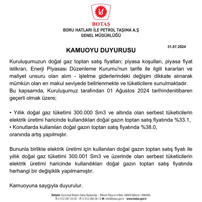 Konutlarda kullanılan doğal gaza bugünden itibaren geçerli olmak üzere yüzde 38 zam yapıldı. Fiyat artışının nihai tüketiciye yansımasının Türkiye ortalamasının yüzde 24-25 olacağı belirtildi. BOTAŞ'ın internet sitesinde ağustosta geçerli olacak mesken ve sanayi abonelerinin tarifesi ile elektrik üretim amaçlı tarife tablosu yayımlandı. Buna göre, ağustos itibarıyla konutlarda kullanılan doğal gazın toptan satış fiyatı yüzde 38, yıllık doğal gaz tüketimi 300 bin metreküp ve altında olan serbest tüketicilerin elektrik üretimi haricinde kullandıkları doğal gazın satış fiyatı ise yüzde 33,1 arttı. Enerji Bakanlığı da doğal gazda devletin yüzde 60 sübvansiyon uyguladığını, bu sayede fiyat artışının nihai tüketiciye yansımasının Türkiye ortalamasında yüzde 24-25 olacağını duyurdu. Elektrik üretimi için kullanılan doğal gazın toptan satış fiyatı ile yıllık doğal gaz tüketimi 300 bin 1 metreküp ve üzerinde olan serbest tüketicilerin elektrik üretimi haricinde kullandıkları doğal gazın satış fiyatında değişiklik olmadı. Sanayi abonelerinin tarifesi, kademe 1 için 1000 metreküp doğal gazda 8 bin 549 lira, kademe 2 için ise 11 bin 380 lira olarak belirlendi. Elektrik üretim amaçlı tarifede ise 1000 metreküp doğal gazın fiyatı 12 bin lira olarak duyuruldu. BOTAŞ'ın konut tüketicileri için dağıtım şirketlerine ağustosta uygulayacağı satış fiyatı ise 1000 metreküp doğal gaz için 5 bin 631 lira olarak açıklandı. Doğal gazda fiyat tarifeleri aylık hesaplanıyor. Kurumun internet sitesinde yer alan duyuruda, "Kuruluşumuzun doğal gaz toptan satış fiyatları, piyasa koşulları, piyasa fiyat istikrarı, Enerji Piyasası Düzenleme Kurumunun tarife ile ilgili kararları ve maliyet unsuru olan alım-işletme giderlerindeki değişim dikkate alınarak mümkün olan en makul seviyede belirlenmekte ve tüketicilere sunulmaktadır." ifadesi kullanıldı. Kaynak: BOTAŞ [news_id:741152]