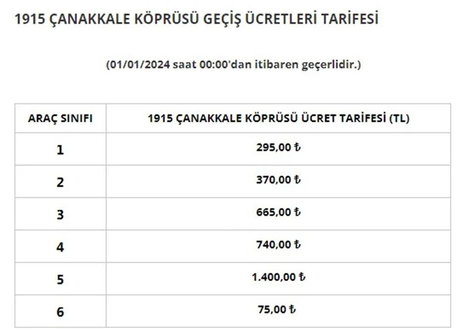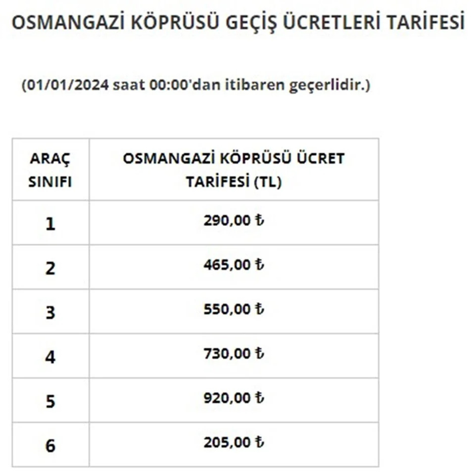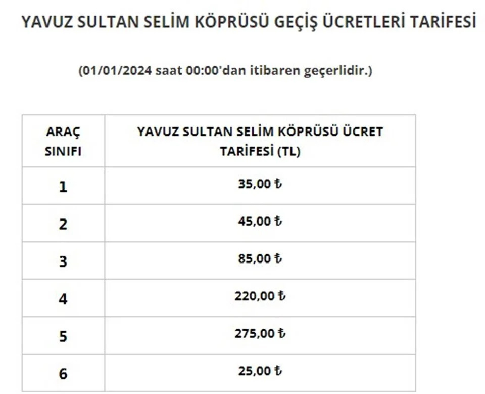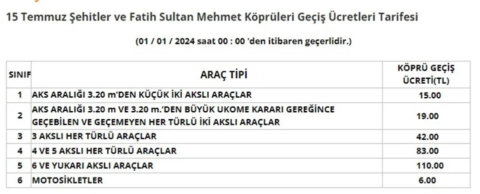 Karayolları Genel Müdürlüğü (KGM), bugünden itibaren geçerli olacak otoyol ve köprü geçiş ücretlerini açıkladı. İşte zamlanan köprü ve otoyol ücretleri... Otoyol ve köprü geçiş ücretlerine yapılan zamlar, ekim ayında Cumhurbaşkanı Recep Tayyip Erdoğan’ın talimatıyla 1 Ocak 2024’e ertelenmişti. [news_id:712241] Bu kapsamda Karayollları Genel Müdürlüğü, bugünden itibaren geçerli olacak zamlı köprü ve otoyol geçiş fiyatlarını açıkladı. Karayolları Genel Müdürlüğü'nden yapılan açıklamada ise şu ifadeler kullanıldı: "Karayolları Genel Müdürlüğünce ve Yap-İşlet-Devret (YİD) kapsamında özel şirketler tarafından işletilen otoyol ve köprülerin geçiş ücretleri, 1 Ocak 2024 Pazartesi günü saat 00.00'dan itibaren geçerli olmak üzere yeniden düzenlenmiştir. Yönetmeliğe göre her yıl başında Üretici Fiyat Endeksi (ÜFE)'ye göre düzenlenmesi gereken geçiş ücretlerinde; 2022 yılında Üretici Fiyat Endeksi'ndeki yüzde 97,72 oranındaki yükselişe rağmen düzenleme yapılmamış, mevcut geçiş ücretleri 1 Ocak 2022 tarihinden bu yana uygulanmıştır. Otoyolların daha ekonomik, güvenli ve daha kısa sürede ulaşım imkânı sağlaması, boğaz köprülerine büyük bakım onarımların yapılarak servis ömürlerinin uzatılması, işçilik ve malzeme fiyatlarındaki artışlar ile bakım-işletme maliyetlerindeki yükselmeler göz önüne alınarak; Karayolları Genel Müdürlüğünce işletilen otoyol ve boğaz köprülerinin geçiş ücretleri ortalama yüzde 76 oranında, YİD Modeli ile yapılarak özel şirketler tarafından işletilen otoyol ve köprülerin geçiş ücretleri ortalama yüzde 50 oranında artırılmıştır. Buna göre, Karayolları Genel Müdürlüğü tarafından işletilen otoyollarda otomobil için en düşük geçiş ücreti 9 TL, en yüksek geçiş ücreti 84 TL, boğaz köprüleri tek yön otomobil geçiş ücreti ise 15 TL olarak belirlenmiştir. YİD projelerine ait köprülerin otomobil için geçiş ücretleri ise; Osmangazi Köprüsü'nde 290 TL, 1915 Çanakkale Köprüsü'nde 295 TL, Yavuz Sultan Selim Köprüsü'nde 35 TL olarak belirlenmiştir." Hangi araç ne kadar ödeyecek? 15 Temmuz Şehitler ve Fatih Sultan Mehmet Köprüsü Yapılan zamla birlikte 15 Temmuz Şehitler ve Fatih Sultan Mehmet Köprüsü'nden hafif ticari araçların geçişi 8,50 TL'den 15 liraya çıkartıldı. 1915 Çanakkale Köprüsü Çanakkale Köprüsü'nde otomobillerin geçiş ücreti 205 liradan 295 liraya çıkarıldı. Yavuz Sultan Selim Köprüsü Yavuz Sultan Selim Köprüsü’nde otomobillerin geçiş ücreti 20 liradan 35 liraya çıkarıldı. Osmangazi Köprüsü Osmangazi Köprüsü’nde otomobillerin geçiş ücreti 190 liradan 290 liraya çıkarıldı.