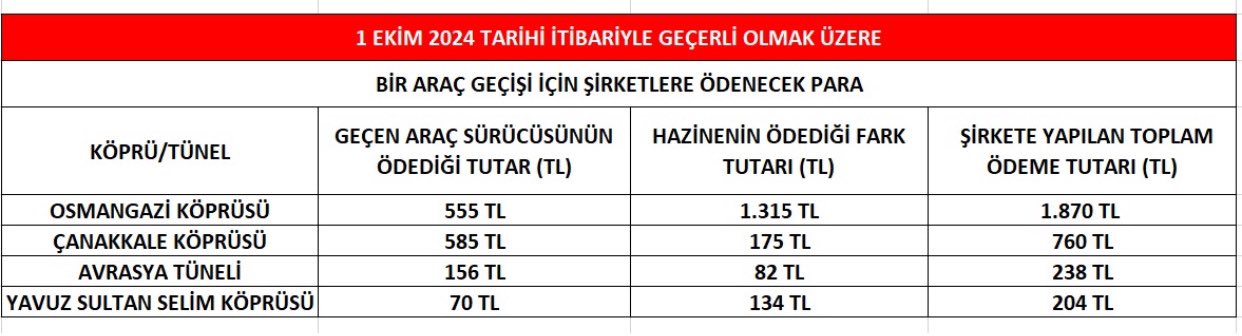Osmangazi, Çanakkale, Yavuz Sultan Selim köprüleri ile Avrasya Tüneli’ne verilen garanti tutarlarına kur zammı yapıldı. Farkın en yüksek olduğu köprü ise Osmangazi oldu. Yap-işlet-devret modeliyle işletilen köprü, tünel ve otoyollara verilen garanti tutarlarına kur zammı yapıldı. Buna göre CHP Genel Başkan Yardımcısı Deniz Yavuzyılmaz, köprü ve tüneller için bugünden itibaren geçerli olacak biçimde kur ayarlaması yapıldığını aktardı. “Geçen araç ücretleri sabit kalacak, Hazine'nin ödeyeceği fark artacak” Yavuzyılmaz, geçen araç ücretlerinin sabit kalacağını belirttiği paylaşımda garanti tutarlarındaki artışa ilişkin şunları aktardı: 📌 Osmangazi Köprüsü’nde; Geçen araç ücreti 555 TL olarak kalacak ancak Hazinenin şirkete garanti ettiği araç geçiş ücreti 1.870 TL’ye çıkıyor. Hazinenin şirkete köprüden geçen her araç için ödeyeceği fark tutarı 1.315 TL’ye yükselecek. 📌 Çanakkale Köprüsü’nde; Geçen araç ücreti 585 TL olarak kalacak ancak Hazinenin şirkete garanti ettiği araç geçiş ücreti 760 TL’ye çıkıyor. Hazinenin şirkete köprüden geçen her araç için ödeyeceği fark tutarı 175 TL’ye yükselecek. 📌 Avrasya Tüneli’nde; Geçen araç ücreti 156 TL olarak kalacak ancak Hazinenin şirkete garanti ettiği araç geçiş ücreti 238 TL’ye çıkıyor. Hazinenin şirkete tünelden geçen her araç için ödeyeceği fark tutarı 82 TL’ye yükselecek. 📌 Yavuz Sultan Selim Köprüsü’nde; Geçen araç ücreti 70 TL olarak kalacak ancak Hazinenin şirkete garanti ettiği araç geçiş ücreti 204 TL’ye çıkıyor. Hazinenin şirkete köprüden geçen her araç için ödeyeceği fark tutarı 134 TL’ye yükselecek. Ayrıca bu projelerde garanti edilen günlük araç geçiş sayıları tutturulamazsa, Hazine şirketlere tutturulamayan sayıdaki her araç için: Osmangazi Köprüsü’nde 1.870 TL Çanakkale Köprüsü’nde için 760 TL Avrasya Tüneli’nde 238 TL YSS Köprüsü’nde 204 TL ödemek durumunda.” Kaynak: Deniz Yavuzyılmaz