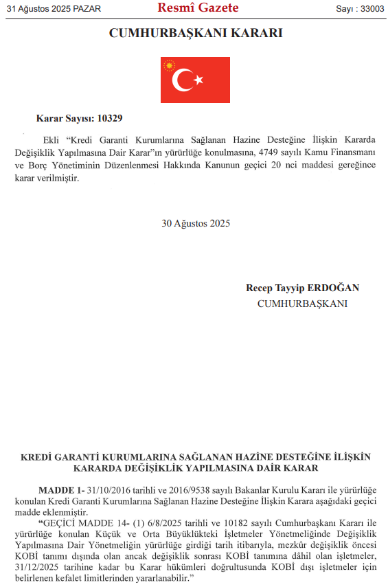 Resmi Gazete'de yayımlanan yönetmelik değişikliğiyle KOBİ tanımına dahil olan işletmeler de yıl sonuna kadar "KOBİ dışı işletmeler" için belirlenen kefalet limitlerinden faydalanabilecek. "Kredi Garanti Kurumlarına Sağlanan Hazine Desteğine İlişkin Kararda Değişiklik Yapılmasına Dair Cumhurbaşkanı Kararı", Resmi Gazete'de yayımlanarak yürürlüğe girdi. Kararla, KOBİ Yönetmeliği'nde Değişiklik Yapılmasına Dair Yönetmeliğin yürürlüğe girdiği tarih itibarıyla, söz konusu değişiklik öncesi KOBİ tanımı dışında bulunan ancak değişiklik sonrası KOBİ tanımına dahil olan işletmeler, 31 Aralık'a kadar KOBİ dışı işletmeler için belirlenen kefalet limitlerinden faydalanabilecek. Kaynak: Resmi Gazete