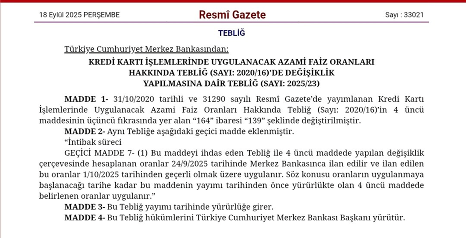 Türkiye Cumhuriyet Merkez Bankası'nın (TCMB) kredi kartlarında uygulanacak faiz oranlarına ilişkin kararı 1 Ekim itibarıyla yürürlüğe girecek. Değişiklikle birlikte kredi kartıyla yapılacak işlemlerde faiz oranı 4,75'ten 4,50'ye indirilecek. Türkiye Cumhuriyet Merkez Bankası (TCMB) tarafından hazırlanan tebliğin 18 Eylül tarihli Resmi Gazete'de yayımlanmasının ardından tüm kredi kartlarının faiz oranlarında değişiklik öngören düzenleme 1 Ekim 2025 tarihi itibarıyla yürürlüğe girecek. Kredi kartı faizlerinde yapılacak 25 baz puanlık indirimle birlikte akdi faiz çarşamba günü itibarıyla yüzde 4,75'ten yüzde 4,50'ye, gecikme faizi ise yüzde 5,05'ten yüzde 4,80'e indirilecek. Kaynak: Resmi Gazete