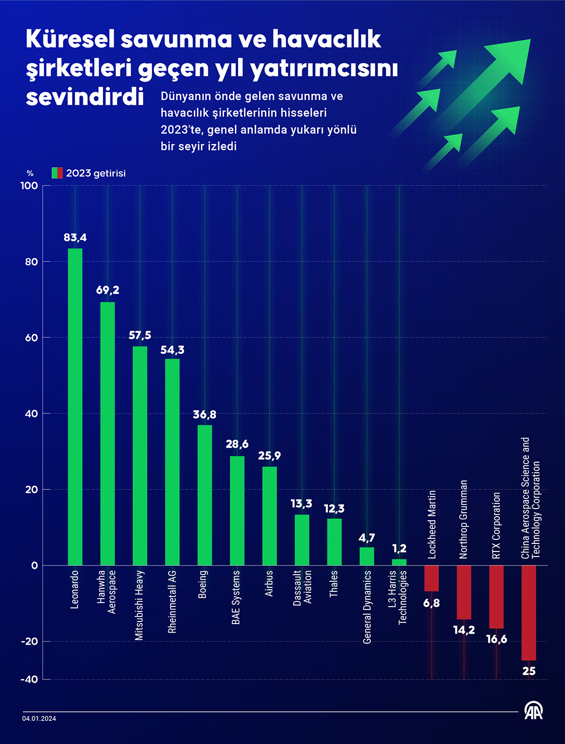 Dünyanın önde gelen savunma ve havacılık şirketleri, geçen yıl borsalarda genel olarak yatırımcısına kazanç sağladı. 2023'te yapılan anlaşmalar, yeni projeler ve alınan siparişler ise savunma ve havacılık şirketlerinin hisseleri için destekleyici unsur oldu. Dünyanın önde gelen savunma ve havacılık şirketlerinin hisseleri 2023'te, genel anlamda yukarı yönlü bir seyir izledi. Yapılan anlaşmalar, yeni projeler ve alınan siparişler savunma ve havacılık şirketlerinin hisseleri için destekleyici unsur oldu. İsrail ile Filistin arasında başlayan çatışmalar geçen yıl küresel piyasalarda risk iştahını olumsuz etkileyen önemli unsurlardan bir tanesi olsa da savunma sanayisi hisselerinde kayda değer yükselişler görüldü. Özellikle çatışmaların bölgede yayılabileceği ve başka devletlerin de savaşa katılabileceği endişeleri öne çıktı. Geçen yıl hisse senedi piyasalarında ABD merkezli şirketler General Dynamics yüzde 4,7, L3 Harris Technologies yüzde 1,2, Boeing yüzde 36,8 kazandırdı. General Dynamics, Kanada Ordusu'nun Komuta, Kontrol, İletişim, Bilgisayar, İstihbarat, Gözetleme ve Keşif (C4ISR) sistemini desteklemek üzere toplam 1,3 milyar dolarlık ihale kazanmıştı. General Dynamics'in üçüncü çeyrek hisse başına karı da 3,04 dolarla beklentileri aşmıştı. Endonezya da Amerikan Boeing şirketiyle 24 adet F-15EX savaş uçağı satın almak için mutabakat zaptı imzalamıştı. Avrupalı şirketlerin performansı dikkat çekti 2023'te Alman Rheinmetall AG'nin hisseleri yüzde 54,3, İngiliz BAE Systems'in hisseleri yüzde 28,6, Fransız şirketler Dassault Aviation'ın hisseleri yüzde 13,3, Thales'in hisseleri yüzde 12,3, İtalyan Leonardo'nun hisseleri yüzde 83,4, Avrupa merkezli çok uluslu havacılık şirketi Airbus'ın hisseleri yüzde 25,9 değer kazandı. Asyalı şirketlere bakıldığında hisse senedi piyasalarında Güney Koreli Hanwha Aerospace yüzde 69,2, Japon Mitsubishi Heavy yüzde 57,5 kazandırdı. Japonya, İngiltere ve İtalya savunma bakanları, geçen yıl üç ülkenin 2035 yılına kadar ortak savaş uçağı geliştirme projesi için koordinasyon kurulu oluşturulmasında anlaşmıştı. Savaş uçağı projesinde ana üstleniciler Japonya'dan Mitsubishi Heavy, İngiltere'den BAE Systems ve İtalya'dan Leonardo S.P.A'dan uzmanların koordinasyon kurulunda yer alması kararlaştırılmıştı. İngiltere Savunma Bakanlığı ile BAE Systems arasında 155 mm top mermisi ve mühimmat tedarik etmek için anlaşma sağlanmıştı. BAE Systems bu anlaşmayla 361 milyon dolar değerinde sipariş aldı. Şirket ayrıca ABD Deniz Piyadeleri için İtalyan şirketi Iveco Defence Vehicles iş birliğiyle Amfibi Muharebe Aracı (ACV) tasarlamaya karar verdi. Fransız savunma sanayisinin önemli şirketlerinden Dassault Aviation yeni siparişleri karşılamak için yakın dönemde önceliklerinin Rafale savaş uçaklarını üretmek olduğunu bildirdi. Hindistan, 26 Rafale uçağı alacağını duyururken Endonezya da 42 Rafale sipariş ettiğini açıklamış ve bu kapsamda 24'ünün kesinleştiğini duyurdu. Şirket, uzun menzilli Falcon 6X'in, jetin ABD ve Avrupa sertifikasını almasının üzerinden sadece üç ay geçtikten sonra, 30 Kasım'da hizmete girdiğini açıkladı. Irak'ın Fransız Thales şirketinden Ground Master 400 tipi radarlardan oluşan 600 milyon avroluk C4I sistemi tedarikine hazırlandığına dair haberler de şirket hisselerini olumlu etkileyen faktörler arasında yer aldı. Şirket ayrıca Fransa ve Malezya arasındaki savunma işbirliği çerçevesinde Malezya Kraliyet Hava Kuvvetleri'ne komple istasyon altyapısı ile birlikte teslim edilecek yeni GM400α uzun menzilli radar tedariki için bir sözleşme imzaladı. Çin'in Hong Kong Özel İdari Bölgesinin bayrak taşıyıcı hava yolu şirketi Cathay Pasific ise geçen yıl Avrupalı uçak üreticisi Airbus'tan 32 adet uçak satın alacağını açıkladı. Alman Silahlı Kuvvetleri de (Bundeswehr), Airbus Helicopters ile 82 adetlik çok rollü H145M helikopteri satın almak üzere sözleşme imzaladı. Güney Kore, silah ihracatında önemli bir konuma yükselirken Hanwha Aerospace'nin obüs üretim kapasitesini iki katına çıkaracağına yönelik haberler de şirketin hisse performansını olumlu yönde etkiledi. Kaynak: AA ABD merkezli şirketlerde düşüş ABD merkezli şirketler RTX Corporation yüzde 16,6, Lockheed Martin yüzde 6,8 ve Northrop Grumman ise yatırımcısına yüzde 14,2 kaybettirdi. China Aerospace Science and Technology Corporation'ın hisseleri de geçen yıl yüzde 25 azalış kaydetti. Yatırımcısını memnun edemeyen bu şirketlere bakıldığında özellikle maliyetlere ilişkin sıkıntıların öne çıktığı görüldü. ABD'de hükümetin kapanma riski de şirketlerin hisse performanslarını olumsuz etkilemişti.
