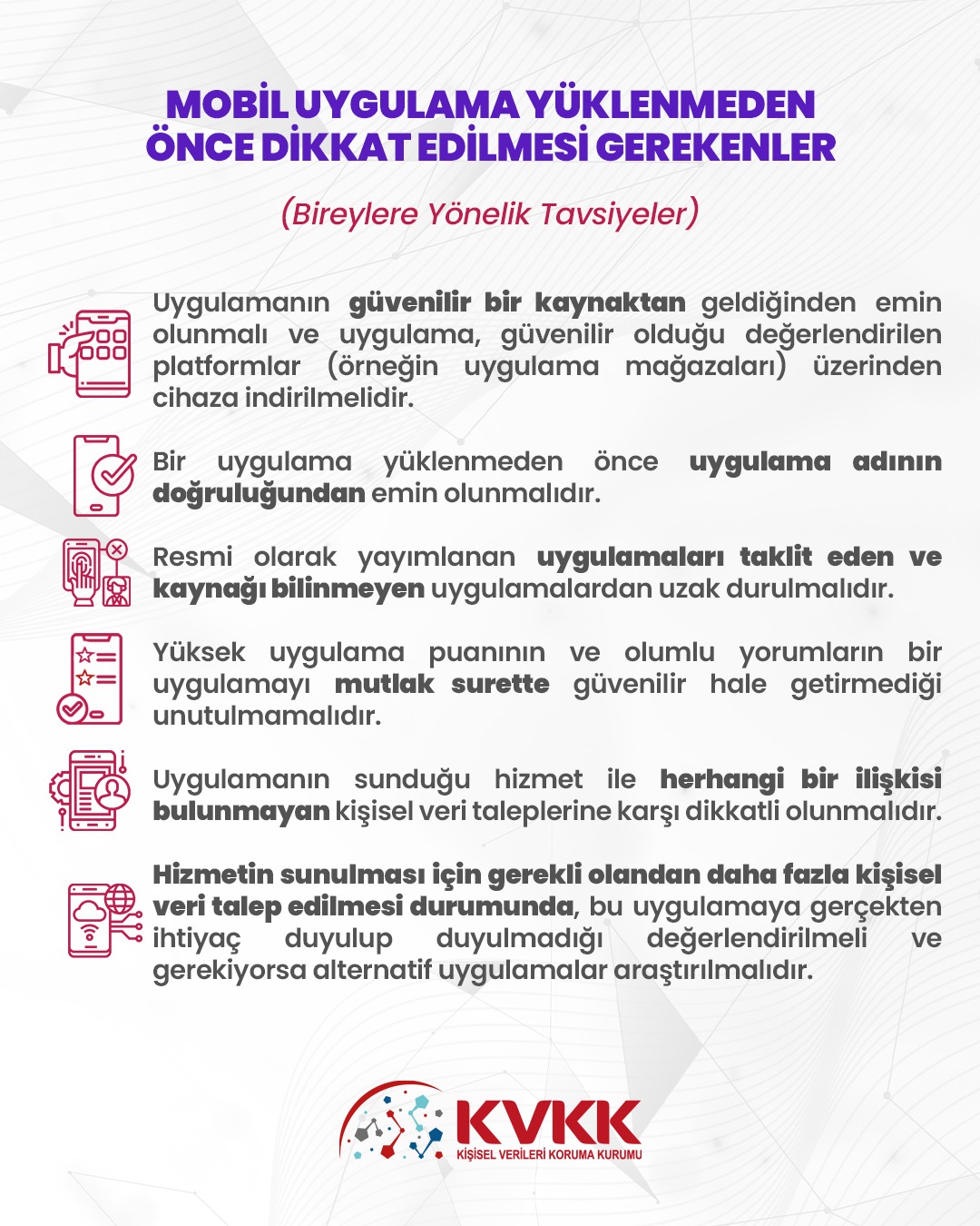 Kişisel Verileri Koruma Kurumu (KVKK), Instagram'ın kapanması ile birlikte VPN uygulamalarının kullanımının arttığını belirterek, bu uygulamaların yol açabileceği zararlar konusunda uyarıda bulundu ve bir mobil uygulama yüklemeden önce dikkat edilmesi gereken konuları açıkladı. BTK tarafından Instagram'ın erişime kapatılması ile birlikte kullanıcılar sosyal medya uygulamasına girebilmek için farklı yöntemler kullanmaya başlamıştı. Kapatılan platforma ulaşabilmek için ise en popüler yöntemlerden bir tanesi VPN kullanımı olmuştu. Kişinin cihazının IP adresini başka bir ülkedeymiş gibi göstererek uygulamalara ve yasaklı sitelere girmeye imkan tanıyan bu özel ağlar konusunda ise KVKK (Kişisel Verileri Koruma Kurumu) tarafından bir uyarı yayınlandı. "Kaynağı belirsiz uygulamalara dikkat" KVKK, sosyal medya hesabı üzerinden yaptığı uyarıda, "Son günlerde kişisel verilerinizin güvenliğini hedef alan ve bu kapsamda finansal bilgileriniz ile sosyal ağ hesaplarınızı ele geçirmeyi hedefleyen kaynağı belirsiz uygulamalara karşı dikkatli olunuz" ifadelerine yer verdi. Paylaşımda ayrıca, "Güvenilir olmayan sanal özel ağ (VPN) uygulamaları, kişisel verilerinizin kötü niyetli kişi veya gruplar tarafından ele geçirilmesine neden olabilir. Bu nedenle, kişisel verilerinizin güvenliği için bu tür uygulamalara karşı dikkatli olunuz" denildi. Bunlara ek olarak KVKK sosyal medya hesabı X üzerinden mobil uygulamaları yüklerken dikkat edilmesi gereken hususlar konulu bir görsel paylaşımında da bulundu. İşte, konuyla ilgili dikkat çekilen maddeler: Kaynak: KVVK - X [news_id:741886]