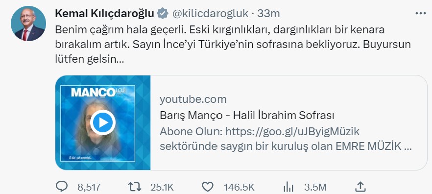 Cumhurbaşkanı adayları, adaylıktan çekildiğini açıklayan Muharrem İnce’ye yönelik açıklamalarda bulundu. Cumhurbaşkanlığı adaylığından çekilen Muharrem İnce'ye olan çağrısının hâlâ geçerli olduğunu söyleyen Kılıçdaroğlu, sosyal medya hesabından yaptığı paylaşımda dargınlıkları bir kenara bırakma ve birleşme çağrısında bulundu. Kılıçdaroğlu, mesajına Barış Manço'nun Halil İbrahim Sofrası şarkısını da ekleyerek, çağrısını şu sözlerle duyurdu, "Benim çağrım hala geçerli. Eski kırgınlıkları, dargınlıkları bir kenara bırakalım artık. Sayın İnce’yi Türkiye’nin sofrasına bekliyoruz. Buyursun lütfen gelsin…" Kaynak: Kemal Kılıçdaroğlu - Twitter Erdoğan ise Muharrem İnce'nin cumhurbaşkanı adaylığından çekilmesiyle ilgili, "Adaylardan bir tanesi adaylıktan çekilmiş. Tabii niye çekildi anlamak mümkün değil. Doğrusu üzüldüm. Keşke bu yarış sonuna kadar böyle devam etseydi ama ne oldu da acaba çekildi bilemiyorum." ifadelerini kullandı. ATA İttifakı'nın cumhurbaşkanı adayı Sinan Oğan ise kendisinin de adaylıktan çekileceği iddialarının gündeme gelmesi üzerine, "Daha yeni başladık, isteyen varsa bizim lehimize çekilebilir!" ifadelerini kullandı. Kaynak: Sinan Oğan - Twitter Tıklayın: Cumhurbaşkanı adayı Muharrem İnce adaylıktan çekildi!
