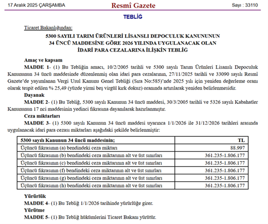 Resmi Gazete’de yayımlanan kararla lisanslı depoculuk faaliyetlerinde uygulanacak idari para cezaları artırıldı. Karara göre lisanslı depoculuk faaliyetlerinde gelecek yıl uygulanacak idari para cezaları 88 bin 997 lira ila 1 milyon 806 bin 177 lira arasında değişiklik gösterecek. Ticaret Bakanlığının "Tarım Ürünleri Lisanslı Depoculuk Kanunu'nun 34. Maddesine Göre 2026 Yılında Uygulanacak Olan İdari Para Cezalarına İlişkin Tebliğ"i Resmi Gazete'de yayımlandı. Tebliğle, Tarım Ürünleri Lisanslı Depoculuk Kanunu'nun ilgili maddesinde düzenlenen idari para cezaları tespit edildi. Buna göre, idari para cezaları 2025 yılı için yeniden değerleme oranı olarak tespit edilen yüzde 25,49 oranında artırılarak yeniden belirlendi. Bu kapsamda gelecek yıl uygulanacak idari para cezaları 88 bin 997 lira ile 1 milyon 806 bin 177 lira arasında olacak. Tebliğ, 1 Ocak 2026'da yürürlüğe girecek. Kaynak: Resmi Gazete
