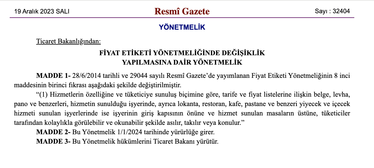 Resmi Gazetede yayımlanan yönetmeliğe göre 1 Ocaktan itibaren lokanta, restoran, kafe ve pastanelerde fiyat listelerinin giriş kapısı ve masalara konulması zorunlu olacak. Ticaret Bakanlığı'nın fiyat etiketlerine yönelik önemli kararı bugünkü Resmi Gazete'de yayımlandı. Karara göre lokanta, restoran, kafe, pastane ve benzeri yiyecek içecek hizmeti veren iş yerleri, fiyat listelerini giriş kapısı ve masa üstlerine koymak zorunda olacak. Uygulama 1 Ocak 2024 tarihi itibarıyla başlayacak. İşte Resmi Gazete'de yer alan o karar: Kaynak: Resmi Gazete Yönetmeliğin 8'inci maddesinin birinci fıkrası değişiklikten önce işletmelerin, tarife ve fiyat listelerine ilişkin belge, levha, pano ve benzerleri, hizmetin sunulduğu iş yerinde, tüketiciler tarafından kolaylıkla görülebilir ve okunabilir şekilde asılması, takılması veya konulmasını kapsıyordu. Yeni düzenlemeye göre ise yiyecek ve içecek hizmeti sunulan iş yerlerinde; iş yerinin giriş kapısının önüne ve hizmet sunulan masaların üstüne, tüketiciler tarafından kolaylıkla görülebilir ve okunabilir şekilde asılması, takılması veya konulması gerekiyor. [news_id:718343]