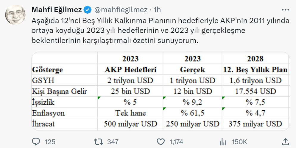 Eski Hazine Müsteşarı Mahfi Eğilmez, 2011 yılında ortaya konulan 2023 hedefleri ile birlikte 12'nci Kalkınma Planı'nı inceledi. Cumhurbaşkanlığı Hükümet Sistemi'nin ikinci kalkınma planı olan 2024-2028 dönemini kapsayan 12. Kalkınma Planı, Cumhurbaşkanı Erdoğan'ın onayının ardından TBMM Başkanlığı'na sunuldu. [news_id:711250] Sosyal medya platformu X hesabından 2011'de koyulan hedefler ile 2023 gerçekleşmelerini inceleyen Eğilmez'in paylaştığı tablo ise şöyle oldu: Kaynak: Mahfi Eğilmez - X Eğilmez'in paylaştığı tabloya göre, beş yıllık kalkınma planında GSYH 1 trilyon dolar olarak hesaplanırken, kişi başına gelir 12 bin dolar, işsizlik yüzde 9,2, enflasyon yüzde 61,5, ihracat ise 250 milyar dolar olarak hesaplandı.