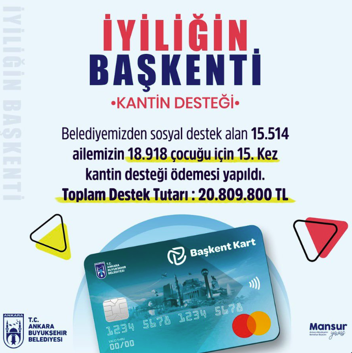 ABB Başkanı Mansur Yavaş, sosyal destek kapsamında 15 bin 514 aile için 18 bin 918 çocuğa 15. kez kantin desteği ödemesinin yapıldığını açıkladı. Toplam destek tutarı ise 20 milyon 809 bin 800 TL oldu. ABB Başkanı Mansur Yavaş, 15 bin 514 ailenin 18 bin .918 çocuğu için 15. kez kantin desteği ödemesinin Başkent Kartlarına yatırıldığını duyurdu. Ankara Büyükşehir Belediye Başkanı Mansur Yavaş, soyal medya hesabı üzerinde sosyal destek kapsamında çocuklara yapılan kantin desteğine ilişkin açıklamada bulundu. Yavaş'ın açıklaması şu şekilde: "İyiliğin Başkenti Ankara'da evlatlarımıza destek olmaya devam ediyoruz. Belediyemizden sosyal destek alan 15 bin 514 ailemizin 18 bin 918 çocuğu için 15. kez kantin desteği ödemesi Başkent Kartlarına yatırıldı. Toplam destek tutarı: 20 milyon 809 bin 800 TL." Kaynak: ANKA