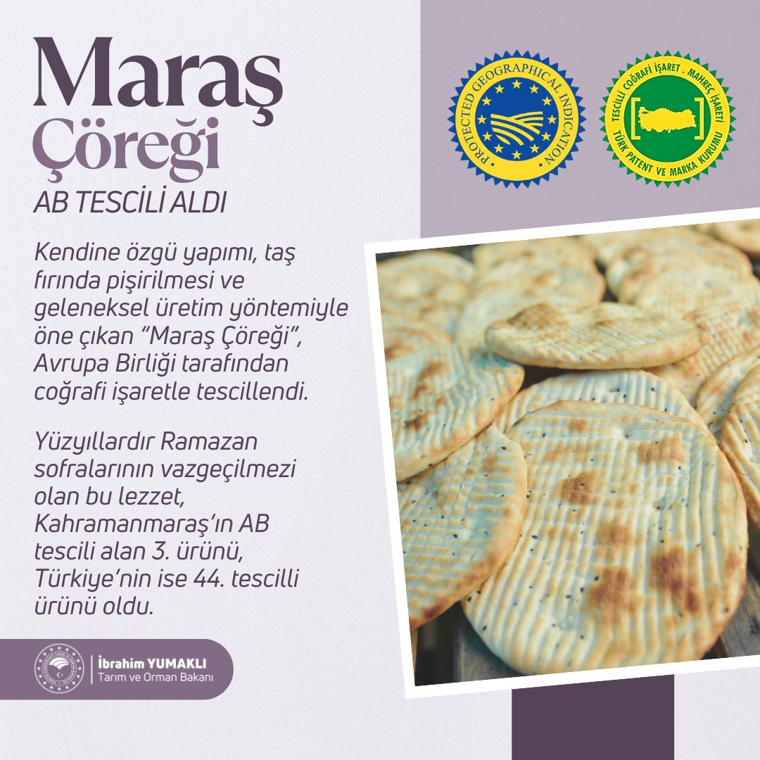 Tarım ve Orman Bakanı İbrahim Yumaklı, Maraş çöreğinin Avrupa Birliği'nden (AB) coğrafi işaret tescili aldığını bildirdi. Yumaklı, NSosyal hesabından konuya ilişkin paylaşım yaptı. Kahramanmaraş'ın asırları aşan lezzetlerinin sınırları da aşmaya devam ettiğini belirten Yumaklı, "Maraş çöreği, Çağlayancerit cevizi ve Maraş tarhanasından sonra AB tarafından tescillenen bir başka Kahramanmaraş lezzeti oldu. Böylelikle AB'den tescilli ürün sayımız 44'e yükseldi." ifadelerini kullandı. Yumaklı'nın paylaşımında yer alan bilgilere göre Maraş çöreği, kendine özgü yapımı, taş fırında pişirilmesi ve geleneksel üretim yöntemiyle öne çıkıyor. Maraş çöreği, yüzyıllardır ramazan sofralarının da vazgeçilmez lezzeti olarak biliniyor. [news_id:791997]