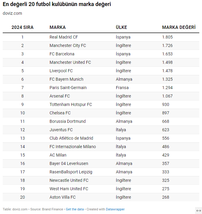 Marka değerlendirme kuruluşu Brand Finance, geçen yıl birinciliği Manchester City'e kaptıran Real Madrid'in bu sene 1 milyar 805 milyon dolarlık marka değeriyle en değerli futbol kulübü olduğunu açıkladı. Önde gelen marka değerlendirme şirketlerinden Brand Finance'ın "Dünya Futbolunun En Değerli İlk 50 Kulüp Markası" çalışmasından yaptığı derlemeye göre, listeye girebilen 50 kulüp arasında ilk 10'da yer alanların marka değeri 13 milyar 673 milyon dolara ulaştı. Milli futbolcu Arda Güler'in de yer aldığı Real Madrid, 1 milyar 805 milyon dolarla en değerli futbol kulübü sıralamasında birinci olurken; 100 üzerinden 96,3 marka gücü skoruyla Google, Coca-Cola, Ferrari ve Rolex gibi belli başlı markaları da geride bıraktı. Öte yandan Real Madrid, sosyal medya platformlarında en çok takip edilen futbol kulübü olma ünvanını da taşımaya devam ediyor. İngiltere takımı Manchester City ise 1 milyar 726 milyon dolarla ikinci sırada yer alırken, onu 1 milyar 653 milyon dolarla Barcelona takip ediyor. İngilizler ilk 10'a damga vurdu En değerli 10 kulübün 6'sını ise İngiliz takımları oluşturdu. İlk 10'da iki İspanyol, bir Fransız ve bir Alman takımı yer aldı. Listede 4'üncü sırayı 1 milyar 498 milyon dolarlık marka değeriyle Manchester United alırken, 1 milyar 478 milyon dolarla Liverpool 5'inci sıranın sahibi oldu. Bayern Münih 1 milyar 325 milyon dolarlık marka değeriyle 6'ncı sıraya yükselirken, Paris Saint-Germain 1 milyar 294 milyon dolarla 7'nci sıraya geriledi. Listenin 8'inci sırasında 1 milyar 67 milyon dolarlık marka değeriyle Arsenal, 9'uncu sırasında 930 milyon dolarla Tottenham Hotspur, 10'uncu sırasında da 897 milyon dolarla Chelsea yer aldı. Yayımlanan listenin son sırasında yer alan İspanya futbol kulübü Villarreal'in marka değeri 100 milyon dolar oldu. İlk 50 içinde İngiltere 18, Almanya 11, İspanya 8, İtalya 6, Fransa 3, Portekiz 2, Hollanda 2 kulüp markasıyla temsil edildi. Araştırmaya göre, en değerli 20 futbol kulübünün marka değerleri (milyon dolar) şöyle listelendi: Türk futbol kulüpleri listede kendisine yer bulamadı En değerli 4 Türk futbol kulübünün 2024 yılı itibarıyla toplam marka değerinin 44 milyon dolar olduğu belirlenirken, Türk futbol kulüpleri en değerli 50 marka içerisinde kendisine yer bulamadı. "Futbolda başarı tesadüf değil" Brand Finance Türkiye Direktörü Muhterem İlgüner, Türk futbolunun değer üretemediğine işaret ederek, "Bu alanda yapılan onca yatırımın ülkeye geri dönüşü istenen düzeyde olmuyor. Spordaki başarıların ülkelerin yumuşak gücü üzerinde önemli etkisi var. Türkiye'nin futbol endüstrisiyle bu güce daha fazla katkıda bulunması gerekiyor." diye konuştu. Sporda, özellikle futbolda başarının bir tesadüf olmadığının altını çizen İlgüner, bunun için federasyonların, belli bir strateji doğrultusunda tutarlı, kararlı ve sabırlı çalışmalarla futbolu "değerli" hale getirmesi gerektiğini söyledi. [news_id:738974] [news_id:735630]