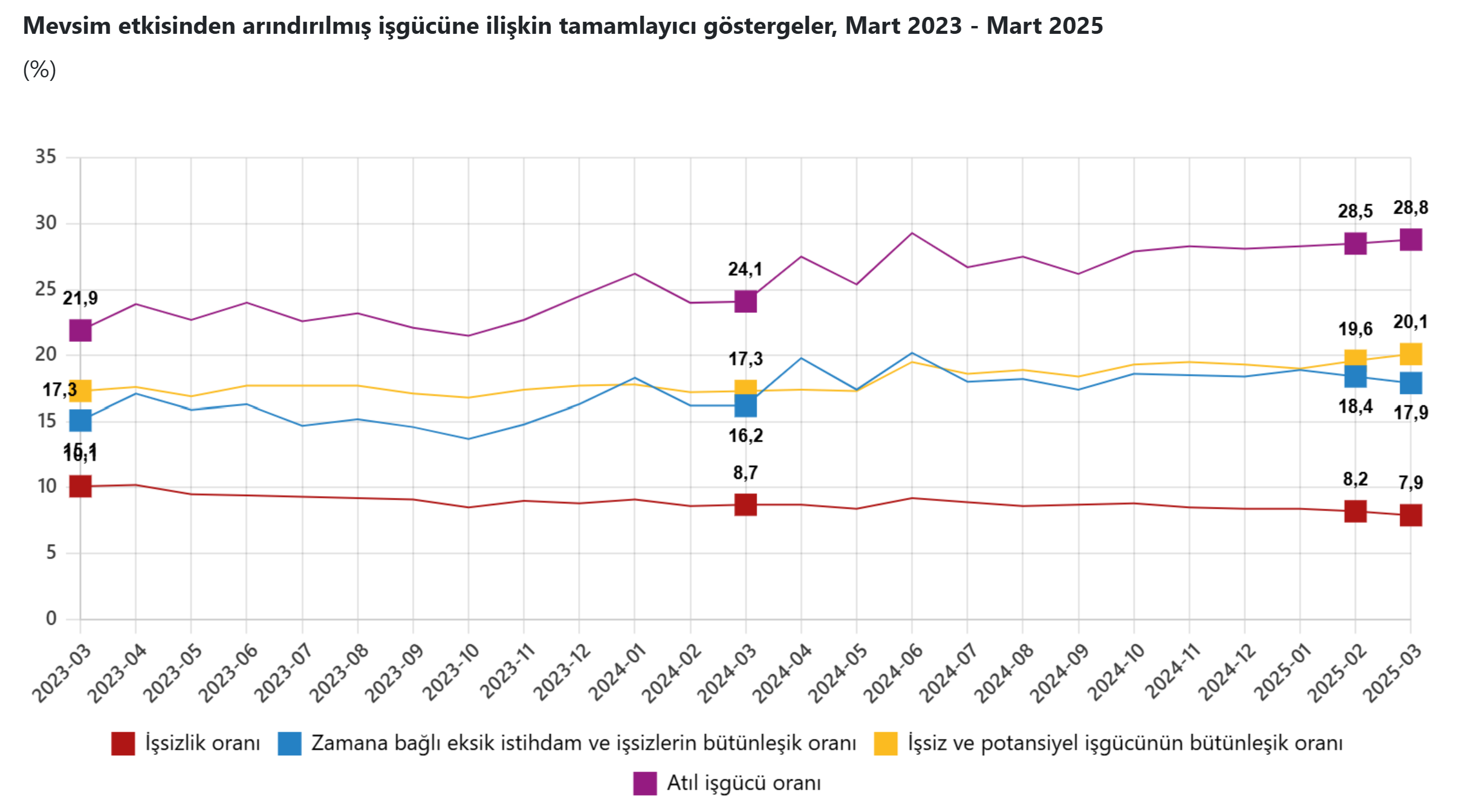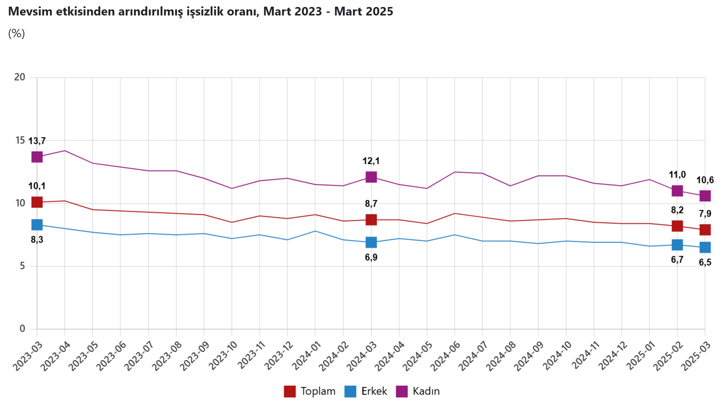 Türkiye İstatistik Kurumu (TÜİK), mart ayına ilişkin işsizlik rakamlarını açıkladı. TÜK'in Hanehalkı İşgücü Araştırması sonuçlarına göre 15 ve daha yukarı yaştaki kişilerde işsiz sayısı 2025 yılı Mart ayında bir önceki aya göre 65 bin kişi azalarak 2 milyon 807 bin kişi oldu. İşsizlik oranı ise 0,3 puan azalarak %7,9 seviyesinde gerçekleşti. İşsizlik oranı erkeklerde %6,5 iken kadınlarda %10,6 olarak tahmin edildi. Kaynak: TÜİK İstihdam edilenlerin sayısı 2025 yılı Mart ayında bir önceki aya göre 391 bin kişi artarak 32 milyon 597 bin kişi, istihdam oranı ise 0,6 puan artarak %49,2 oldu. Bu oran erkeklerde %66,9 iken kadınlarda %31,9 olarak gerçekleşti. İşgücü 2025 yılı Mart ayında bir önceki aya göre 325 bin kişi artarak 35 milyon 404 bin kişi, işgücüne katılma oranı ise 0,4 puan artarak %53,4 olarak gerçekleşti. İşgücüne katılma oranı erkeklerde %71,6 iken kadınlarda %35,7 oldu. Genç nüfusta işsizlik yüzde 15,1 15-24 yaş grubunu kapsayan genç nüfusta işsizlik oranı bir önceki aya göre 0,1 puan artarak %15,1 oldu. Bu yaş grubunda işsizlik oranı; erkeklerde %11,0, kadınlarda ise %22,6 olarak tahmin edildi. İstihdam edilenlerden referans döneminde işbaşında olanların, mevsim ve takvim etkilerinden arındırılmış haftalık ortalama fiili çalışma süresi 2025 yılı Mart ayında bir önceki aya göre 0,3 saat artarak 43,7 saat olarak gerçekleşti. Atıl işgücü oranı yüzde 28,8 Zamana bağlı eksik istihdam, potansiyel işgücü ve işsizlerden oluşan atıl işgücü oranı 2025 yılı Mart ayında bir önceki aya göre 0,3 puan artarak %28,8 oldu. Zamana bağlı eksik istihdam ve işsizlerin bütünleşik oranı %17,9 iken işsiz ve potansiyel işgücünün bütünleşik oranı %20,1 olarak tahmin edildi. Kaynak: TÜİK