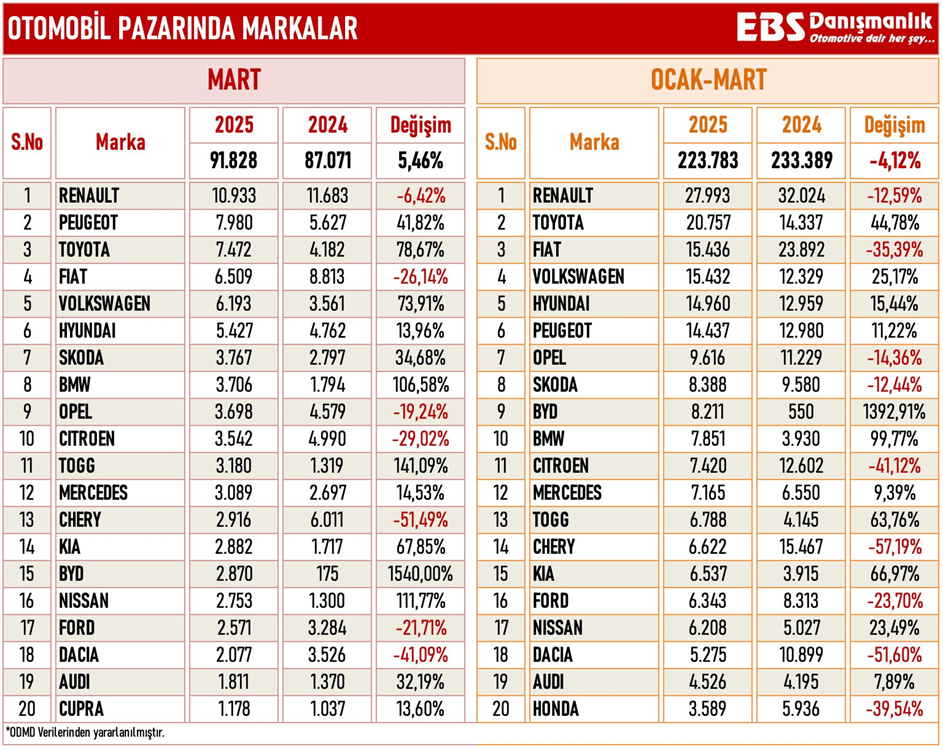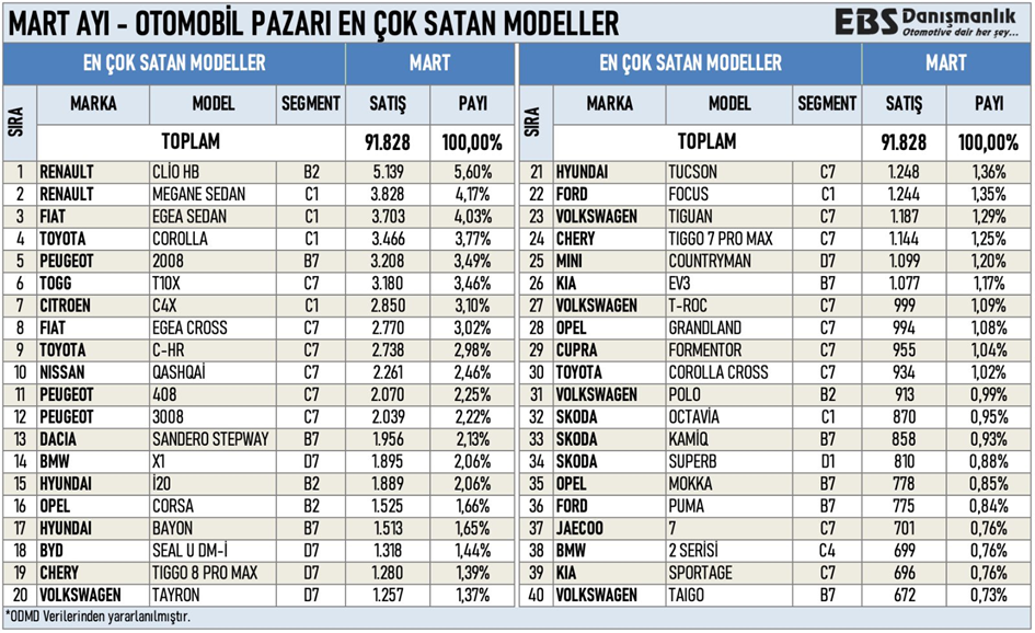 2025 yılına daralmayla başlayan otomobil pazarı mart ayında tüm zamanların en yüksek satış rakamına ulaştı. Peki, bu dönemde en çok satan otomobil markaları hangileri oldu? İşte detaylar.. Otomotiv Distribütörleri ve Mobilite Derneğinin (ODMD) Mart 2025 verilerine göre otomobil satışları yılın ilk çeyreğinde geçen yılın aynı dönemine göre yüzde 4,1 azalarak 223 bin 793, hafif ticari araç satışları da yüzde 15,5 azalarak 52 bin 491 olarak gerçekleşti. Böylelikle toplam otomotiv pazarında satışlar ocak-mart döneminde önceki yılın aynı dönemine göre yüzde 6,5 daralarak 276 bin 284 olarak kaydedildi. [news_id:767667] Mart ayında ise otomobil satışları yüzde 5,5 artışla 91 bin 828, hafif ticari satışları yüzde 10,2 artışla 25 bin 72'ye çıktı. Böylelikle toplam otomotiv pazarında satışlar mart ayında bir önceki senenin aynı ayına göre yüzde 6,4 artışla 116 bin 900 oldu. Satışların %82,2’si vergi oranı düşük araçlarda gerçekleşti Pazarın %82,2’sini vergi oranları düşük olan A, B ve C segmentlerindeki araçlar oluştururken C segmenti otomobiller %56,1 pay, B segmenti otomobiller ise %25,9 pay aldı. Elektrikli araçlara ilgi artıyor Otomotiv Distribütörleri ve Mobilite Derneği (ODMD) verilerine göre martta en fazla otomobil satışı yüzde 49,6 pay ve 111 bin 53 adet ile benzinli araçlarda gerçekleşti. Bu araçları yüzde 28,5 pay ve 63 bin 884 satışla hibrit araçlar, yüzde 13,2 pay ve 29 bin 594 satışla elektrikli araçlar takip etti. Elektrikli otomobiller içerisinde 160 kW altındaki elektrikli otomobil satışları yüzde 65,5 artarken, 160 kW üstü elektrikli otomobil satışları ise yüzde 164,1 artış kaydetti. Bu dönemde, 1600cc altındaki otomobil satışları yüzde 29,3 azalırken, 1600-2000cc aralığındaki otomobil satışları yüzde 9,4 düşüş kaydetti. 2000cc üstü otomobil satışları ise yüzde 22,8 artışa ulaştı. En çok satan otomobil markaları Otomotiv gazetecisi Emre Özpeynirci’nin aktardığı bilgiye göre ise martta satışları geçtiğimiz yıla göre düşen Renault ilk sırada yer alırken, Mart 2024'e göre satışlarını %41,82 artıran Peugeot ikinci (filo etkisi), %78,67 artıran Toyota ise üçüncü sırada yer aldı (ÖTV muafiyet etkisi). Martta gündemdeki VW satışlarını %74 artırarak 5. sırada yer alırken, BMW %106,58'lik büyümeyle 8. sırada yer aldı (ÖTV destekli araç etkisi). Kaynak: EBS Danışmanlık En çok satan otomobil modelleri Mart ayının en çok satan otomobili ise Corolla’yı tahtından indiren Renault Clio HB oldu. Clio’yu Renault Megane, Fiat Egea ve Toyota Corolla takip etti. Peugeot 2008’in 5. sırada yer aldığı listede Togg T10X ise 6. sırada konumlandı. Kaynak: EBS Danışmanlık [news_id:763757] [news_id:762053]
