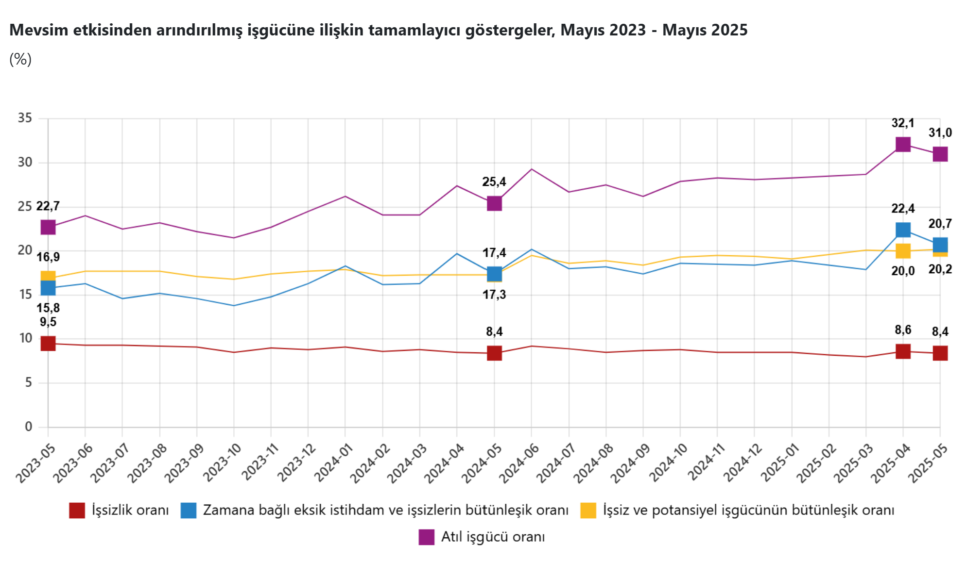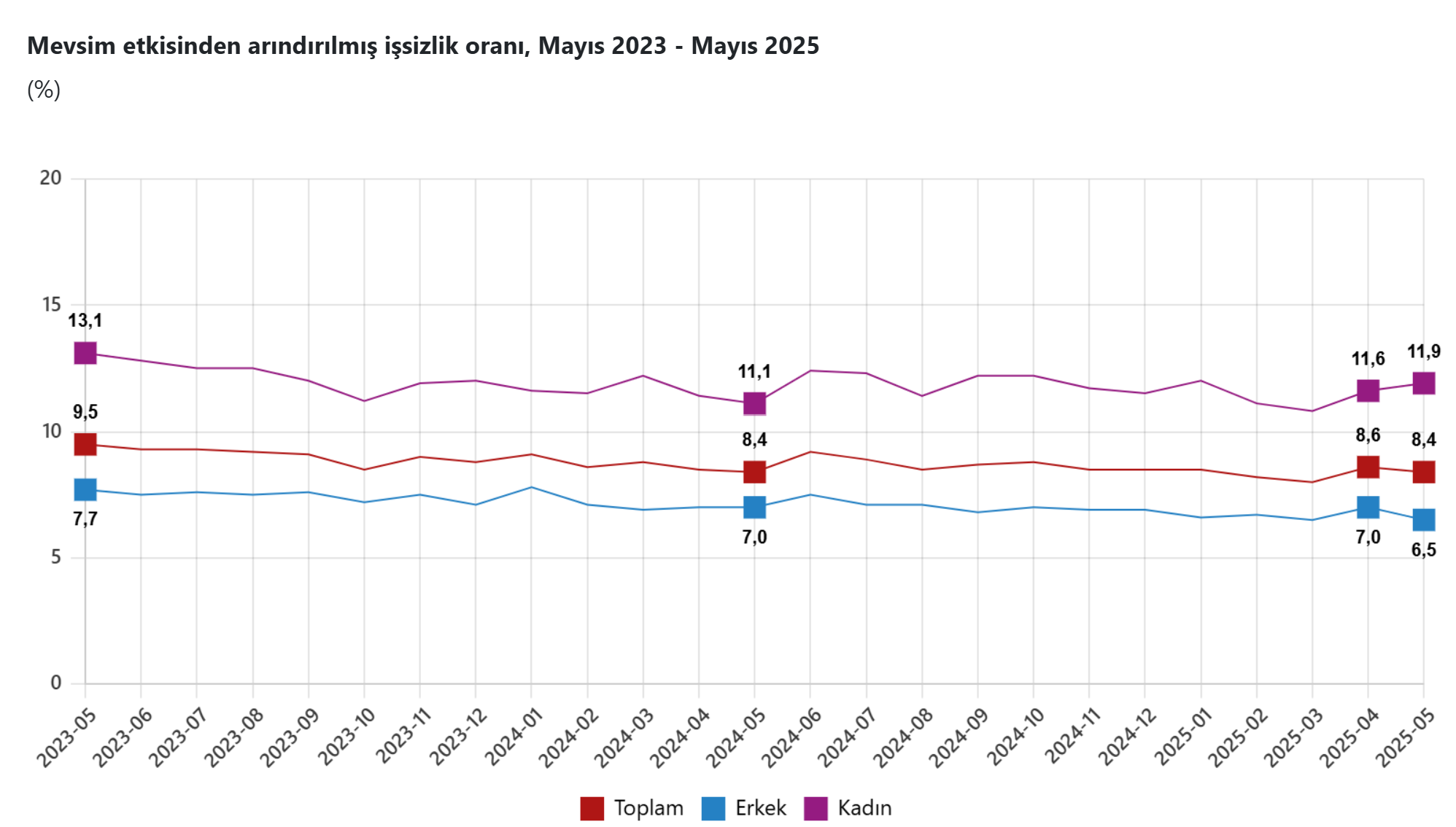 Türkiye İstatistik Kurumu (TÜİK), mayıs ayına ilişkin işsizlik rakamlarını açıkladı. TÜK'in Hanehalkı İşgücü Araştırması sonuçlarına göre 15 ve daha yukarı yaştaki kişilerde işsiz sayısı 2025 yılı Mayıs ayında bir önceki aya göre 69 bin kişi azalarak 2 milyon 972 bin kişi oldu. İşsizlik oranı ise 0,2 puan azalarak %8,4 seviyesinde gerçekleşti. İşsizlik oranı erkeklerde %6,5 iken kadınlarda %11,9 olarak tahmin edildi. Kaynak: TÜİK İstihdam edilenlerin sayısı 2025 yılı Mayıs ayında bir önceki aya göre 100 bin kişi artarak 32 milyon 519 bin kişi, istihdam oranı ise 0,1 puan artarak %49,0 oldu. Bu oran erkeklerde %66,3 iken kadınlarda %32,2 olarak gerçekleşti. İşgücü 2025 yılı Mayıs ayında bir önceki aya göre 31 bin kişi artarak 35 milyon 491 bin kişi, işgücüne katılma oranı ise aynı seviyede kalarak %53,5 olarak gerçekleşti. İşgücüne katılma oranı erkeklerde %70,9 iken kadınlarda %36,5 oldu. Genç nüfusta işsizlik %15,4 15-24 yaş grubunu kapsayan genç nüfusta işsizlik oranı bir önceki aya göre 0,3 puan azalarak %15,4 oldu. Bu yaş grubunda işsizlik oranı; erkeklerde %11,0, kadınlarda ise %23,5 olarak tahmin edildi. Haftalık ortalama fiili çalışma süresi 42,7 saat İstihdam edilenlerden referans döneminde işbaşında olanların, mevsim ve takvim etkilerinden arındırılmış haftalık ortalama fiili çalışma süresi 2025 yılı Mayıs ayında bir önceki aya göre 0,6 saat artarak 42,7 saat olarak gerçekleşti. Zamana bağlı eksik istihdam, potansiyel işgücü ve işsizlerden oluşan atıl işgücü oranı 2025 yılı Mayıs ayında bir önceki aya göre 1,1 puan azalarak %31,0 oldu. Zamana bağlı eksik istihdam ve işsizlerin bütünleşik oranı %20,7 iken işsiz ve potansiyel işgücünün bütünleşik oranı %20,2 olarak tahmin edildi. Kaynak: TÜİK [news_id:776628]