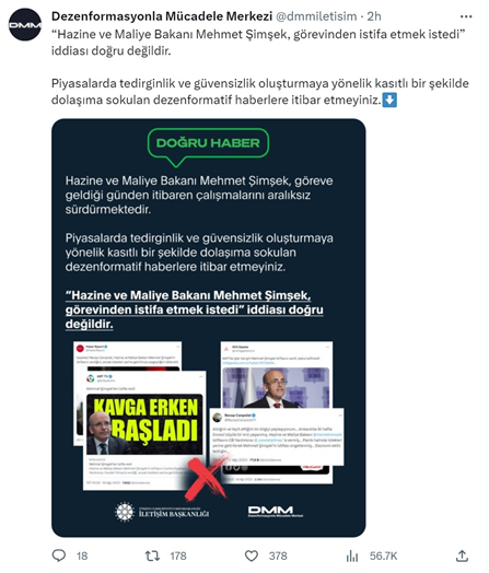 İletişim Başkanlığı Dezenformasyonla Mücadele Merkezi (DMM), Hazine ve Maliye Bakanı Mehmet Şimşek'in istifa etmek istediğine yönelik iddiaların asılsız olduğunu duyurdu. Hazine ve Maliye Bakanı Mehmet Şimşek'in istifa etmek istediğine yönelik iddialarla ilgili açıklama yapıldı. İletişim Başkanlığı Dezenformasyonla Mücadele Merkezi'nden konuyla ilgili yapılan açıklamada şu ifadelere yer verildi: "Hazine ve Maliye Bakanı Mehmet Şimşek, görevinden istifa etmek istedi” iddiası doğru değildir. Piyasalarda tedirginlik ve güvensizlik oluşturmaya yönelik kasıtlı bir şekilde dolaşıma sokulan dezenformatif haberlere itibar etmeyiniz." Kaynak: DMM - X