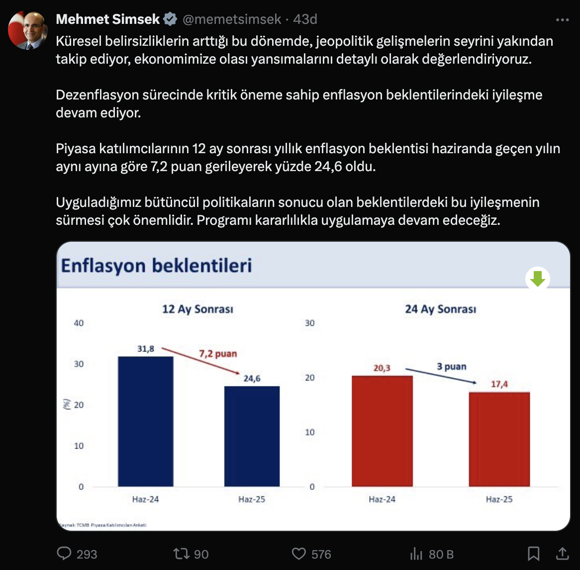 Hazine ve Maliye Bakanı Mehmet Şimşek, dezenflasyon sürecinde kritik öneme sahip enflasyon beklentilerindeki iyileşmenin devam ettiğini bildirdi. Şimşek, sosyal medya hesabında, Türkiye Cumhuriyet Merkez Bankasının (TCMB) haziran Piyasa Katılımcıları Anketi sonuçlarını değerlendirdi. Programı kararlılıkla uygulamaya devam edeceklerine işaret eden Şimşek, şunları kaydetti: "Küresel belirsizliklerin arttığı bu dönemde, jeopolitik gelişmelerin seyrini yakından takip ediyor, ekonomimize olası yansımalarını detaylı olarak değerlendiriyoruz. Dezenflasyon sürecinde kritik öneme sahip enflasyon beklentilerindeki iyileşme devam ediyor. Piyasa katılımcılarının 12 ay sonrası yıllık enflasyon beklentisi haziranda geçen yılın aynı ayına göre 7,2 puan gerileyerek yüzde 24,6 oldu. Uyguladığımız bütüncül politikaların sonucu olan beklentilerdeki bu iyileşmenin sürmesi çok önemlidir."