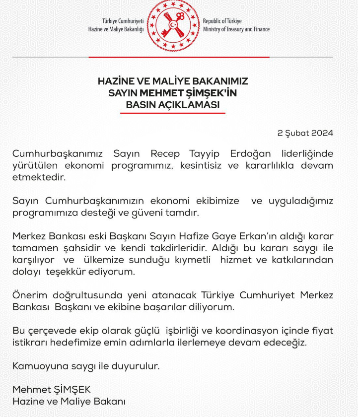 Hafize Gaye Erkan'ın görevden affını istemesinin ardından açıklama yapan Hazine ve Maliye Bakanı Mehmet Şimşek, Erkan döneminin bittiği sinyalini vererek, "Önerim doğrultusunda atanacak TCMB Başkanı ve ekibine başarılar diliyorum" dedi. TCMB Başkanı Hafize Gaye Erkan'ın görevden affını istemesi üzerine açıklama yapan Hazine ve Maliye Bakanı Mehmet Şimşek, "yeni atama" mesajı verdi. Erkan'ın kararı için "şahsi ve kendi takdiridir" diyen Şimşek, "Önerim doğrultusunda yeni atanacak Türkiye Cumhuriyet Merkez Bankası Başkanı ve ekibine başarılar diliyorum" ifadelerini kullandı. Şimşek'in açıklamalasının tamamı ise şöyle oldu: “Cumhurbaşkanımız Sayın Recep Tayyip Erdoğan liderliğinde yürütülen ekonomi programımız, kesintisiz ve kararlılıkla devam etmektedir. Sayın Cumhurbaşkanımızın ekonomi ekibimize ve uyguladığımız programımıza desteği ve güveni tamdır. Merkez Bankası eski Başkanı Sayın Hafize Gaye Erkan’ın aldığı karar tamamen şahsidir ve kendi takdirleridir. Aldığı bu kararı saygı ile karşılıyor ve ülkemize sunduğu kıymetli hizmet ve katkılarından dolayı teşekkür ediyorum. Önerim doğrultusunda yeni atanacak Türkiye Cumhuriyet Merkez Bankası Başkanı ve ekibine başarılar diliyorum. Bu çerçevede ekip olarak güçlü işbirliği ve koordinasyon içinde fiyat istikrarı hedefimize emin adımlarla ilerlemeye devam edeceğiz. Kamuoyuna saygı ile duyurulur.” Kaynak: Hazine ve Maliye Bakanlığı - X [news_id:723105]