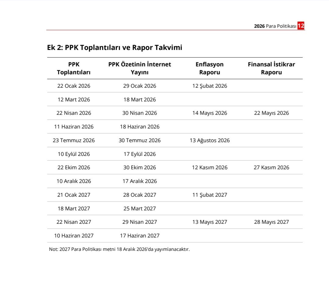 Türkiye Cumhuriyet Merkez Bankası (TCMB), 2026 yılında gerçekleştireceği Para Politikası Kurulu (PPK) toplantıları ve rapor takvimini açıkladı. Merkez Bankası, 2026 yılı takvimini internet sitesinde yayımladı. Buna göre, gelecek yıl 8 PPK toplantısı gerçekleştirecek TCMB, 8 PPK toplantı özeti, 4 enflasyon raporu ve 2 finansal istikrar raporu açıklayacak. Banka, 2027 yılının ilk 6 ayında gerçekleştireceği toplantı ve raporlara da takviminde yer verdi. Merkez Bankası'nın 2026 ve 2027 yılına ilişkin yayımladığı takvim şöyle oldu: Kaynak: TCMB