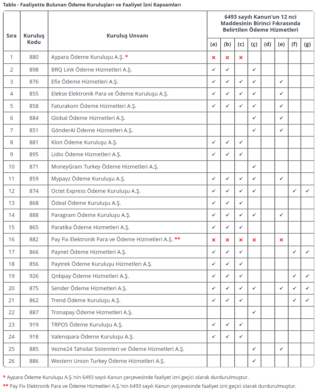 Türkiye Cumhuriyet Merkez Bankası (TCMB), Pay Fix, Aypara ve İninal’ın tüm faaliyet izinlerinin durdurulduğunu açıkladı. Merkez Bankası haklarında soruşturma yürütülen Pay Fix Elektronik Para ve Ödeme Hizmetleri A.Ş. (Pay Fix), İninal Ödeme ve Elektronik Para Hizmetleri A.Ş. (İninal) ve Aypara Ödeme Kuruluşu A.Ş.’nin faaliyet izinlerini durdurduğunu duyurdu. TCMB'den yapılan açıklamada şunlar kaydedildi: "Türkiye Cumhuriyet Merkez Bankası (TCMB) gözetimi ve denetimi altındaki Pay Fix Elektronik Para ve Ödeme Hizmetleri A.Ş. (Pay Fix), İninal Ödeme ve Elektronik Para Hizmetleri A.Ş. (İninal) ve Aypara Ödeme Kuruluşu A.Ş.’nin (Aypara) aralarında yer aldığı şirketler hakkında adli makamlar tarafından yürütülen soruşturma konusunda basındaki haberlere dair kamuoyunu bilgilendirmede fayda görülmüştür. Pay Fix, Aypara ve İninal’ın 6493 sayılı Kanun kapsamındaki faaliyet izinlerinin durdurulmasına giden süreçte; 30 Eylül 2024 tarihli ve 11724/21323 sayılı TCMB kararı ile Pay Fix hakkında 6493 sayılı Kanunun 21’inci maddesinin sekizinci fıkrası kapsamında idari ve mali tedbirler uygulanmıştır. 28 Şubat 2025 tarihli ve 11799/21398 sayılı TCMB kararıyla ise Pay Fix’in 6493 sayılı Kanunun 12’nci maddesinin birinci fıkrasının (b) ve ödeme aracının kabulü ile sınırlı olmak kaydıyla (c) bentlerinde belirtilen ödeme hizmetlerini sunma konularındaki faaliyet izinleri 6493 sayılı Kanunun 21’inci maddesinin sekizinci fıkrası uyarınca durdurulmuştur. Ayrıca, 6493 sayılı Kanunun 27’nci maddesi çerçevesinde idari para cezası uygulanmasına karar verilmiştir. Bunlara ek olarak, söz konusu soruşturma kapsamında yapılan değerlendirmeler neticesinde ise 14 Mart 2025 tarih ve 11811/21410 sayılı TCMB kararı ile Pay Fix, Aypara ve İninal’ın 6493 sayılı Kanun kapsamında tüm faaliyet izinleri durdurulmuştur. TCMB, ödeme ve elektronik para kuruluşlarının güvenli, kesintisiz, etkin ve verimli bir şekilde işlemesini sağlamak amacıyla gözetim ve denetim faaliyetlerini proaktif yaklaşımla sürdürmektedir. Bu kapsamda düzenlenen inceleme raporları görev alanları kapsamında değerlendirilmek üzere ilgili kamu kurum ve kuruluşları ile paylaşılmaktadır." Kaynak: TCMB