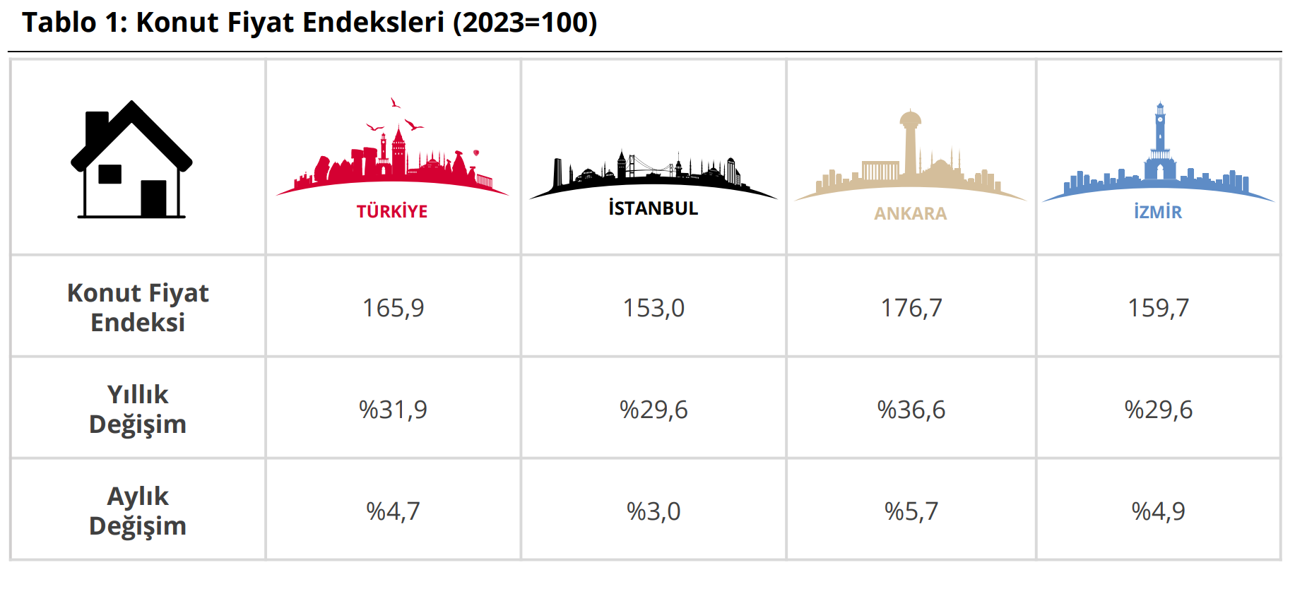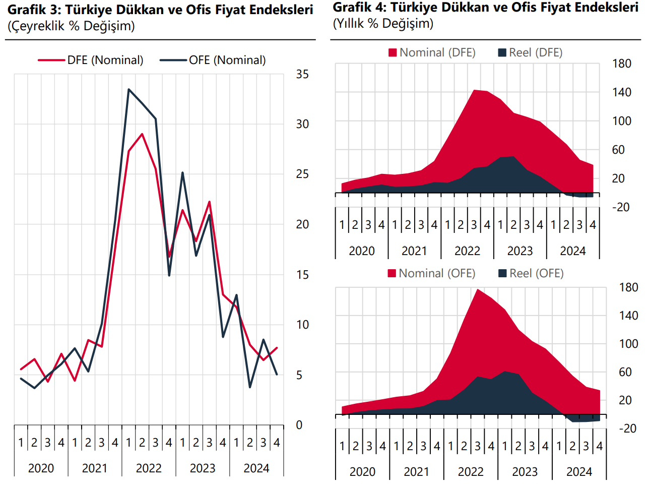 Merkez Bankası verilerine göre Konut Fiyat Endeksi (KFE), 2025 yılının ilk ayında yıllık bazda yüzde 31,9 artarken, reel olarak yüzde 7,2 düşüş kaydetti. Türkiye Cumhuriyet Merkez Bankası tarafından Ocak 2025 dönemine ilişkin Konut Fiyat Endeksi verileri açıklandı. Türkiye'deki konutların kalite etkisinden arındırılmış fiyat değişimlerini izlemek amacıyla hesaplanan KFE (2023=100), ocak ayında bir önceki aya göre yüzde 4,7 artarak 165,9 oldu. 2025’in ilk ayında yıllık bazda yüzde 31,9 artan KFE, reel olarak ise yüzde 7,2 düşüş kaydetti. Üç büyük il için KFE değişimine bakıldığında ocakta bir önceki aya göre İstanbul için yüzde 3, Ankara için yüzde 5,7 ve İzmir için yüzde 4,9 artış görüldü. Endeks değerleri geçen yılın aynı ayına göre ise İstanbul'da yüzde 29,6, Ankara'da yüzde 36,6, İzmir'de yüzde 29,6 yükseldi. Kaynak: TCMB - Konut Fiyat Endeksi Ticari gayrimenkuller de enflasyona yenilmişti TCMB tarafından dün açıklanan Ticari Gayrimenkul Fiyat Endeksi (TGFE) ise 2024'ün son çeyreğinde bir önceki çeyreğe göre gayrimenkul fiyatlarının yıllık bazda nominal olarak yüzde 37,6 artarken, reel olarak yüzde 6,2 azaldığını göstermişti. Söz konusu çeyrekte bir önceki çeyreğe göre yüzde 5 artan Ofis Fiyat Endeksi, bir önceki yılın aynı çeyreğine göre nominal olarak yüzde 33,6 yükselirken, reel olarak yüzde 8,9 azalış kaydetmişti. Türkiye genelinde, 4. çeyrekte bir önceki çeyreğe göre yüzde 7,7 yükselen Dükkan Fiyat Endeksi ise bir önceki yılın aynı dönemine göre nominal olarak yüzde 38,4 artış kaydetmesine karşın reel olarak yüzde 5,6 gerilemişti. Kaynak: TCMB - Ticari Gayrimenkul Fiyat Endeksi