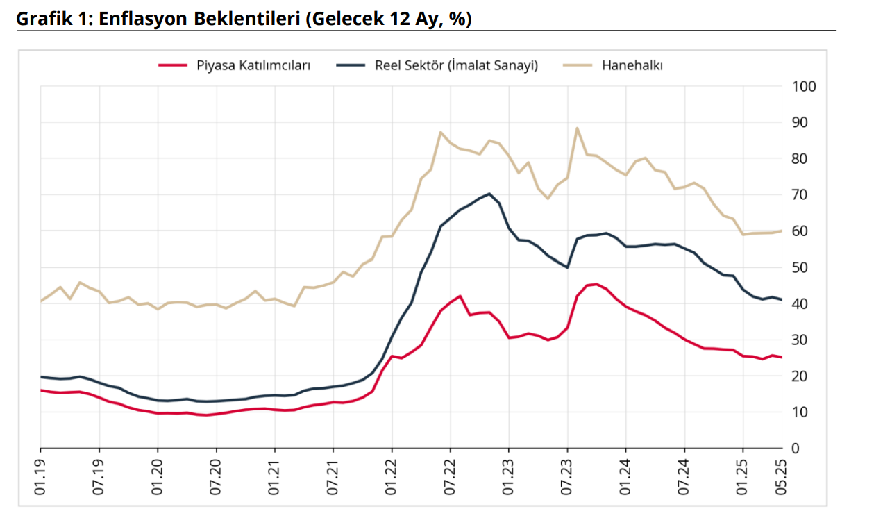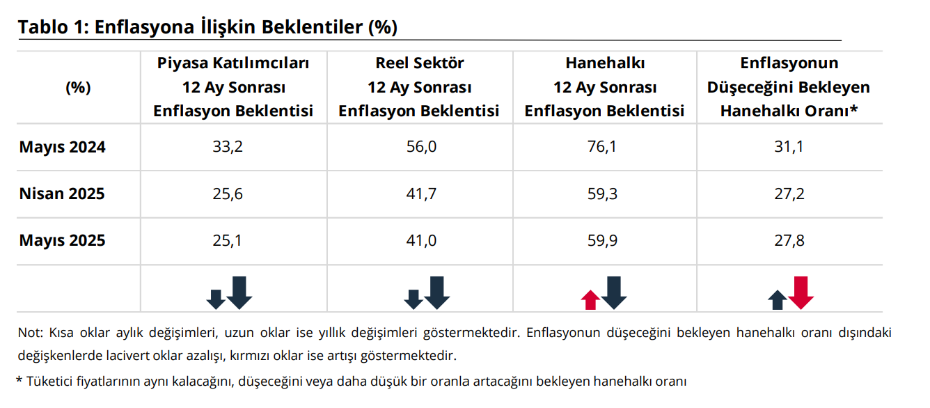 Türkiye Cumhuriyet Merkez Bankası (TCMB), mayıs ayında piyasa katılımcıları, reel sektör ve hanehalkının 12 ay sonrasına ilişkin enflasyon beklentisini açıkladı. TCMB, Mayıs 2025 dönemine ilişkin "Sektörel Enflasyon Beklentileri"ni yayımladı. Piyasa Katılımcıları Anketi, İktisadi Yönelim Anketi ve Türkiye İstatistik Kurumu (TÜİK) iş birliğiyle yürütülen Tüketici Eğilim Anketi ile finansal ve reel sektör uzmanlarının, imalat sanayi firmalarının ve hanehalkının 12 ay sonrası yıllık tüketici enflasyonu beklentileri derlenerek Sektörel Enflasyon Beklentileri elde edildi. Buna göre 2025 yılı Mayıs ayında 12 ay sonrası yıllık enflasyon beklentileri, piyasa katılımcıları için 0,5 puan azalarak yüzde 25,1 seviyesine, reel sektör için 0,7 puan azalarak yüzde 41 seviyesine geriledi. Bu dönemde hanehalkının beklentisi ise 0,6 puan artarak yüzde 59,9 seviyesine çıktı. Kaynak: TCMB - Sektörel Enflasyon Beklentileri Gelecek 12 aylık dönemde enflasyonun düşeceğini bekleyen hanehalkı oranı da bir önceki aya göre 0,6 puan artarak yüzde 27,8 seviyesinde gerçekleşti. Kaynak: TCMB - Sektörel Enflasyon Beklentileri [news_id:772879]