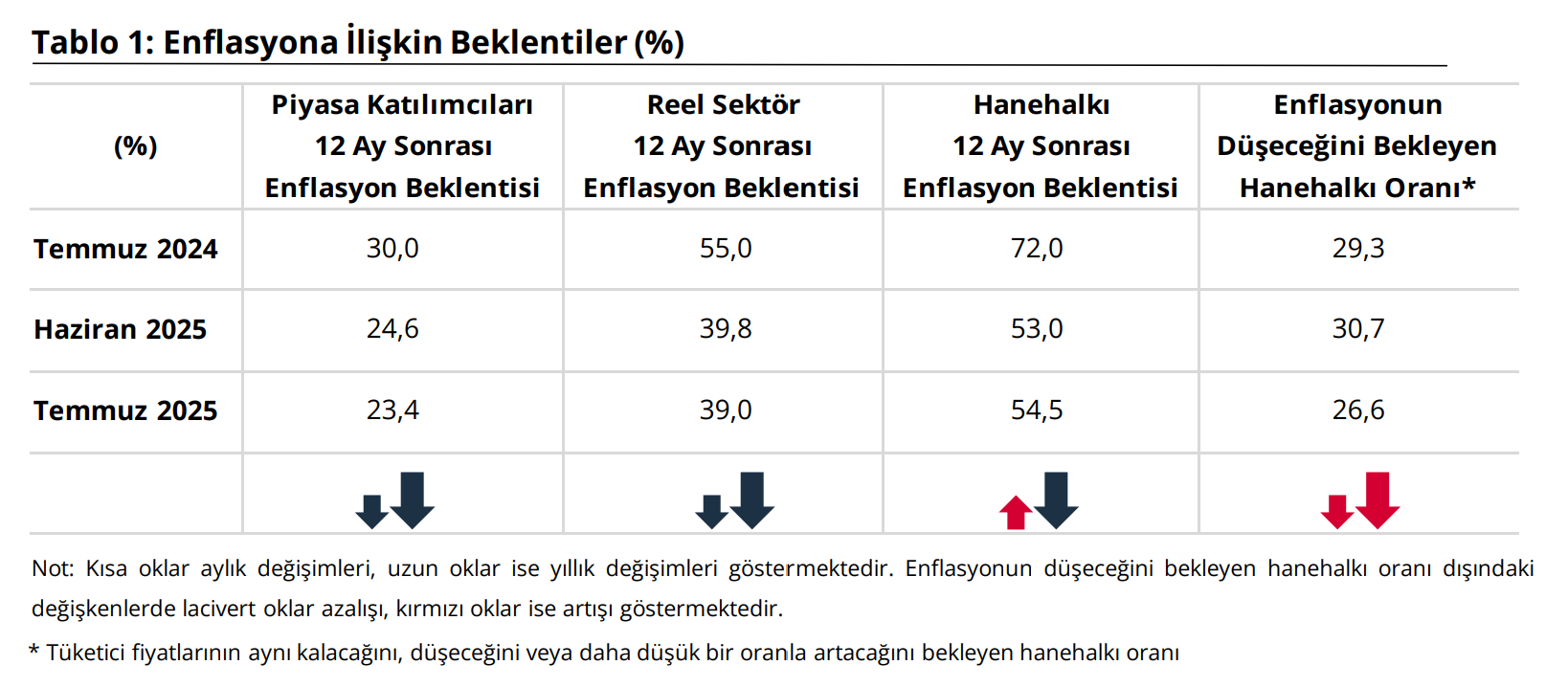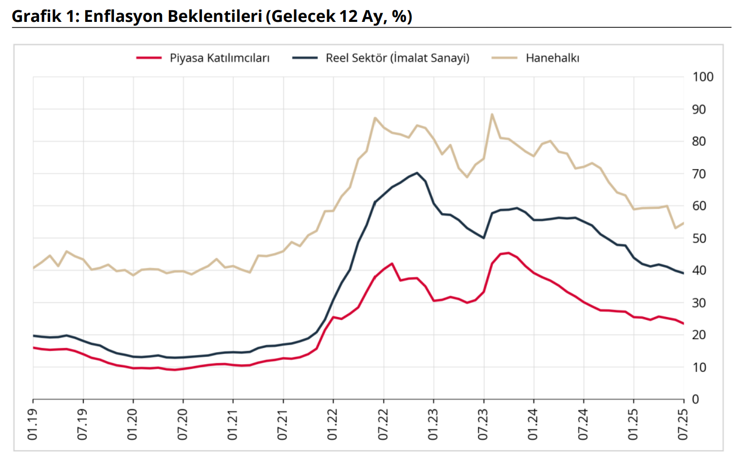 Türkiye Cumhuriyet Merkez Bankası (TCMB), temmuz ayında piyasa katılımcıları, reel sektör ve hanehalkının 12 ay sonrasına ilişkin enflasyon beklentisini açıkladı. TCMB, Temmuz 2025 dönemine ilişkin "Sektörel Enflasyon Beklentileri"ni yayımladı. Piyasa Katılımcıları Anketi, İktisadi Yönelim Anketi ve Türkiye İstatistik Kurumu (TÜİK) iş birliğiyle yürütülen Tüketici Eğilim Anketi ile finansal ve reel sektör uzmanlarının, imalat sanayi firmalarının ve hanehalkının 12 ay sonrası yıllık tüketici enflasyonu beklentileri derlenerek Sektörel Enflasyon Beklentileri elde edildi. Buna göre 2025 yılı Temmuz ayında 12 ay sonrası yıllık enflasyon beklentileri, piyasa katılımcıları için 1,2 puan azalarak yüzde 23,4 seviyesine, reel sektör için 0,8 puan azalarak yüzde 39 seviyesine geriledi. Bu dönemde hanehalkının beklentisi ise 1,5 puan artarak yüzde 54,5 seviyesine yükseldi. Gelecek 12 aylık dönemde enflasyonun düşeceğini bekleyen hanehalkı oranı da bir önceki aya göre 4,1 puan azalarak yüzde 26,6 seviyesine indi. [news_id:779696]